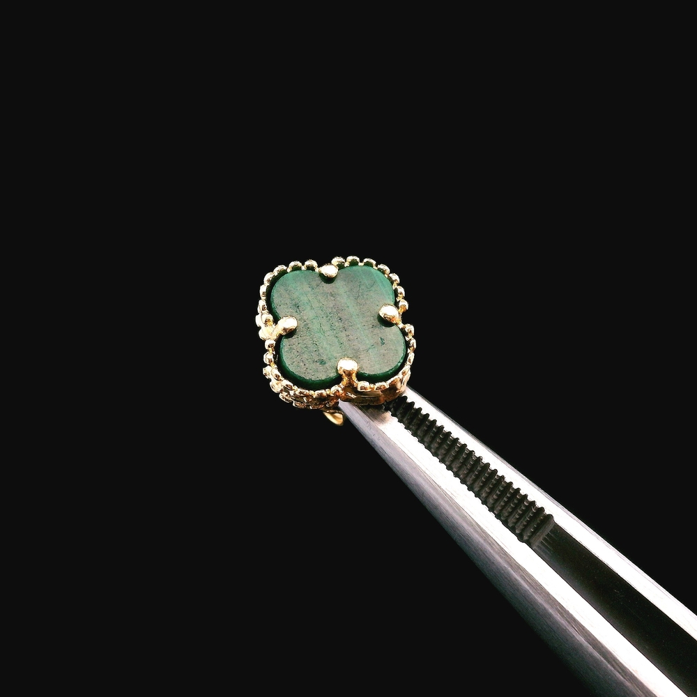 Estos aretes de trébol en malaquita con oro amarillo de 14KT presentan el icónico diseño de cuatro hojas, inspirado en estilos de diseñadores de lujo. La malaquita verde ofrece un toque de color llamativo y el oro pulido añade un acabado refinado. Peso total de 1.1 DWT (1.71 gramos). Incluye caja genérica de joyería.
