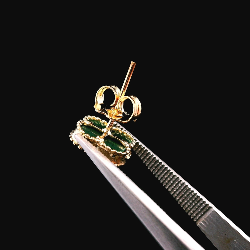 These 14KT yellow gold malachite clover stud earrings feature the iconic four-leaf motif in a style inspired by luxury designer designs. The rich green malachite offers a bold pop of color while the polished gold setting provides a refined finish. Total weight is 1.1 DWT (1.71 grams). Includes a generic jewelry box.