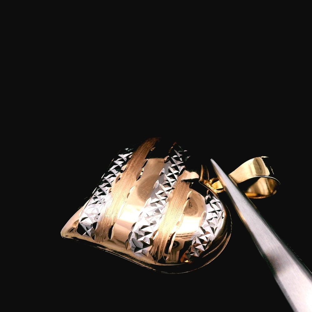 Este dije/colgante de corazón abultado en oro bicolor de 18KT está en buena condición, con ligeras señales de uso normal. El diseño redondeado del corazón ofrece un estilo dulce y atemporal, mientras que el acabado de dos tonos añade contraste y atractivo visual. Con un peso de 1.6dwt, es ligero y fácil de combinar con distintos estilos de cadenas. Una pieza encantadora y versátil ideal para uso diario o como regalo.