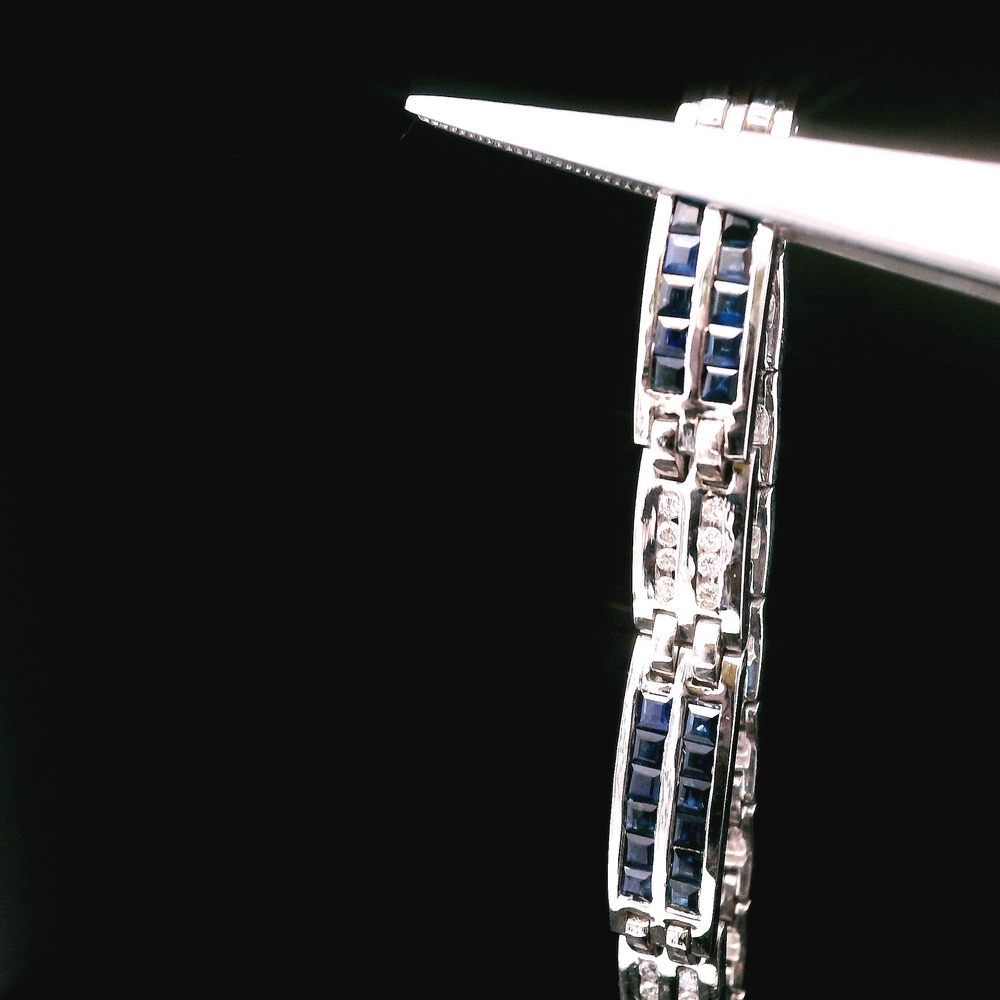 This 18KT white gold bracelet features richly colored natural sapphires accented by approximately 8 points total weight in diamonds, offering a refined and elegant look. Its classic design makes it easy to wear alone or stacked with other bracelets. The bracelet measures 7.5 inches in length and weighs 10.2 DWT (15.86 grams).