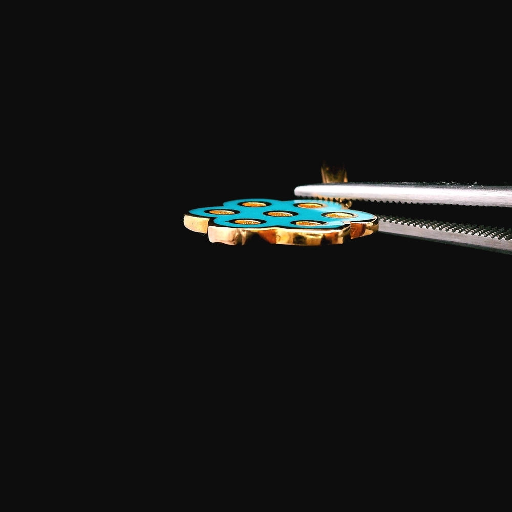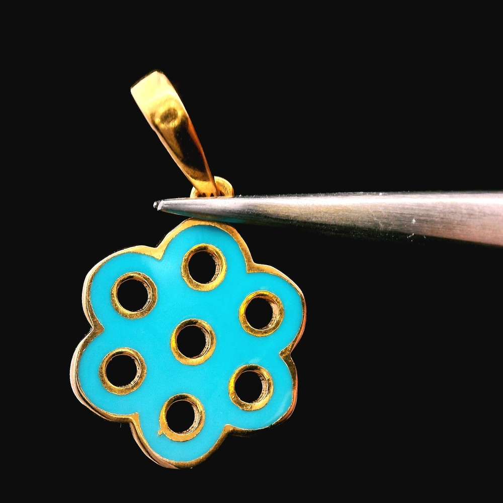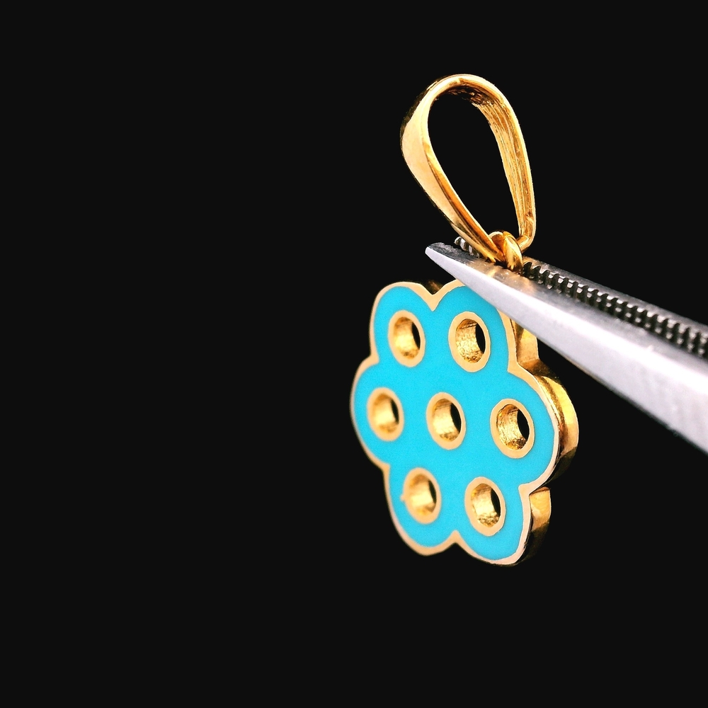 This 21K yellow gold pendant features a turquoise enamel flower design and acts as a charm or necklace pendant. The total weight is 1.0 dwt (approximately 1.6 grams). This item is in Good Condition. It works properly with noticeable wear from use and may show visible marks, surface scratches, or minor blemishes, but nothing that impacts function. Functionality has been verified. Please review all photos closely to assess cosmetic condition as the item shown is the exact one you will receive. Please note: Price may vary depending on the price of gold and silver.