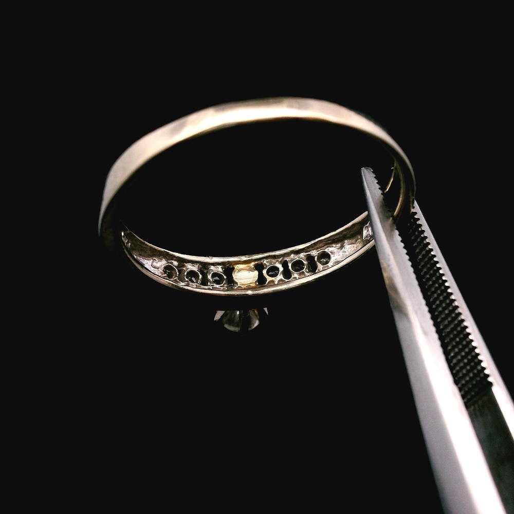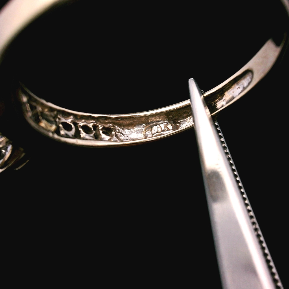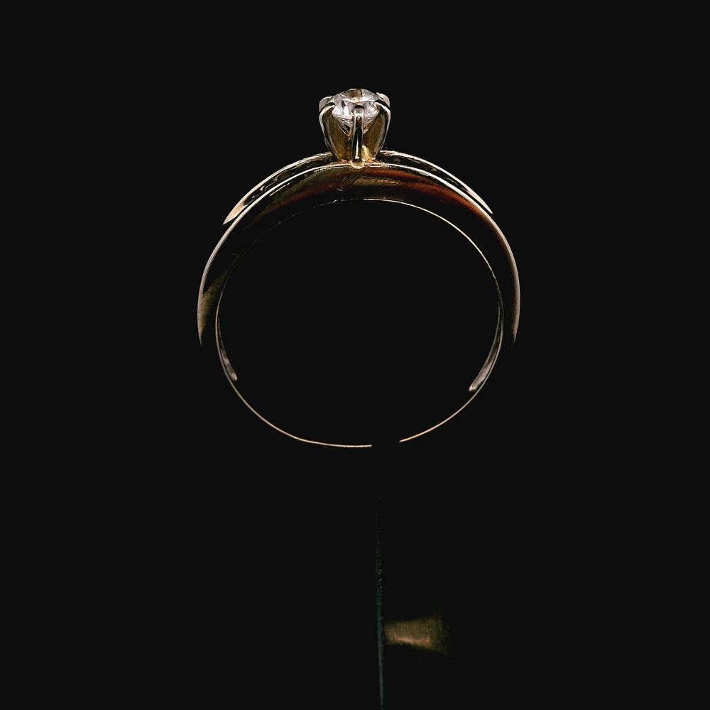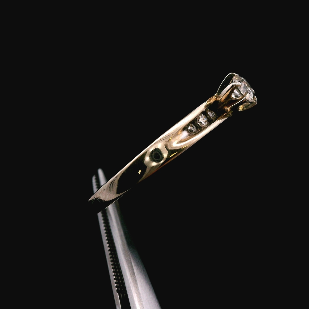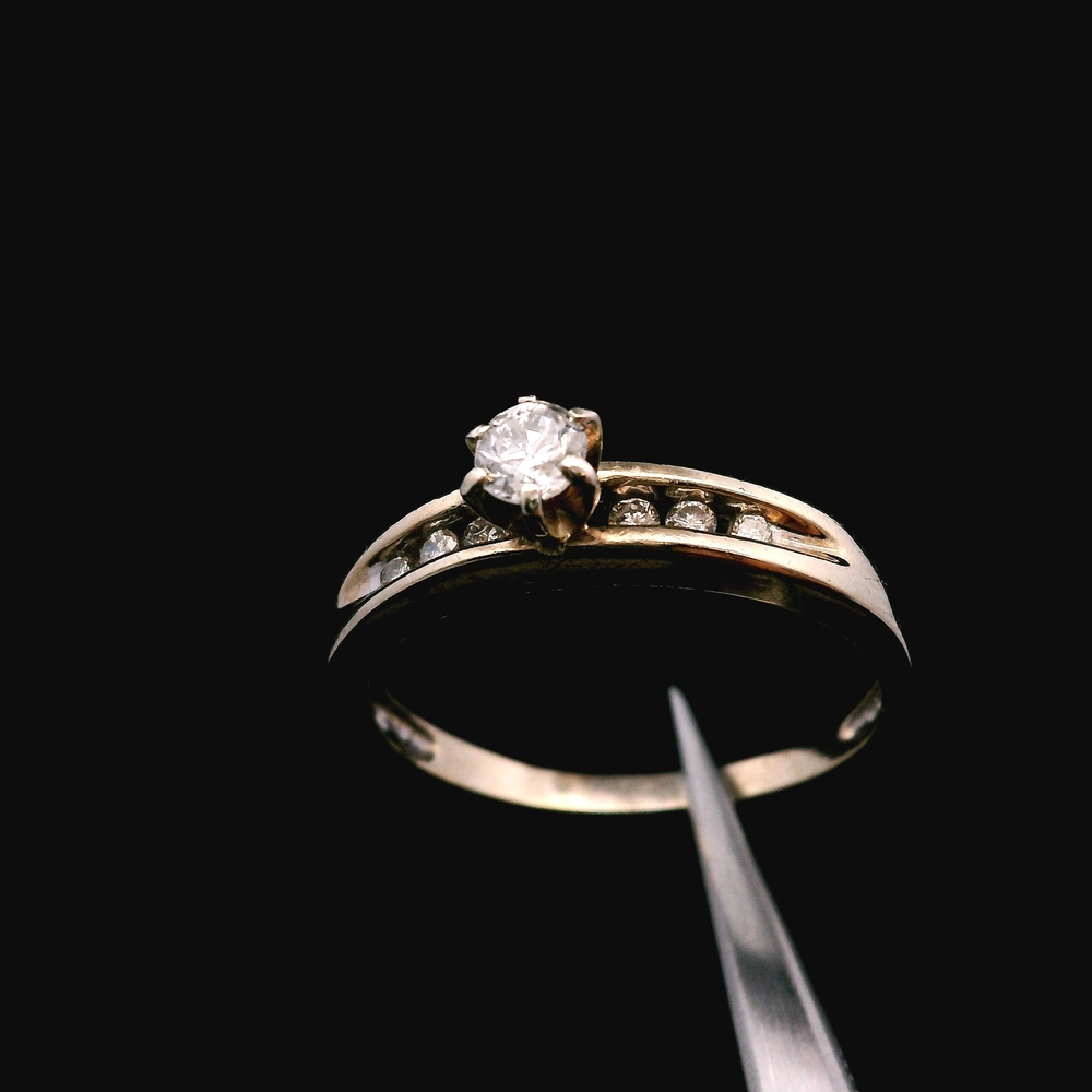 Descripción del Artículo: Este anillo clásico está elaborado en oro de 10K y presenta un diamante central de aproximadamente 1/5 ct acentuado por piedras laterales de 5 pts (aprox. 0.25 CTTW). Es una talla 8.75 y tiene un peso total de 1.6 dwt (aproximadamente 2.5 gramos). El artículo está en buenas condiciones. Por favor revise todas las fotos detenidamente para evaluar la condición cosmética y las características naturales de las piedras, ya que el artículo que se muestra es exactamente el que recibirá. Tenga en cuenta: El precio puede variar dependiendo del precio del oro y la plata.