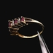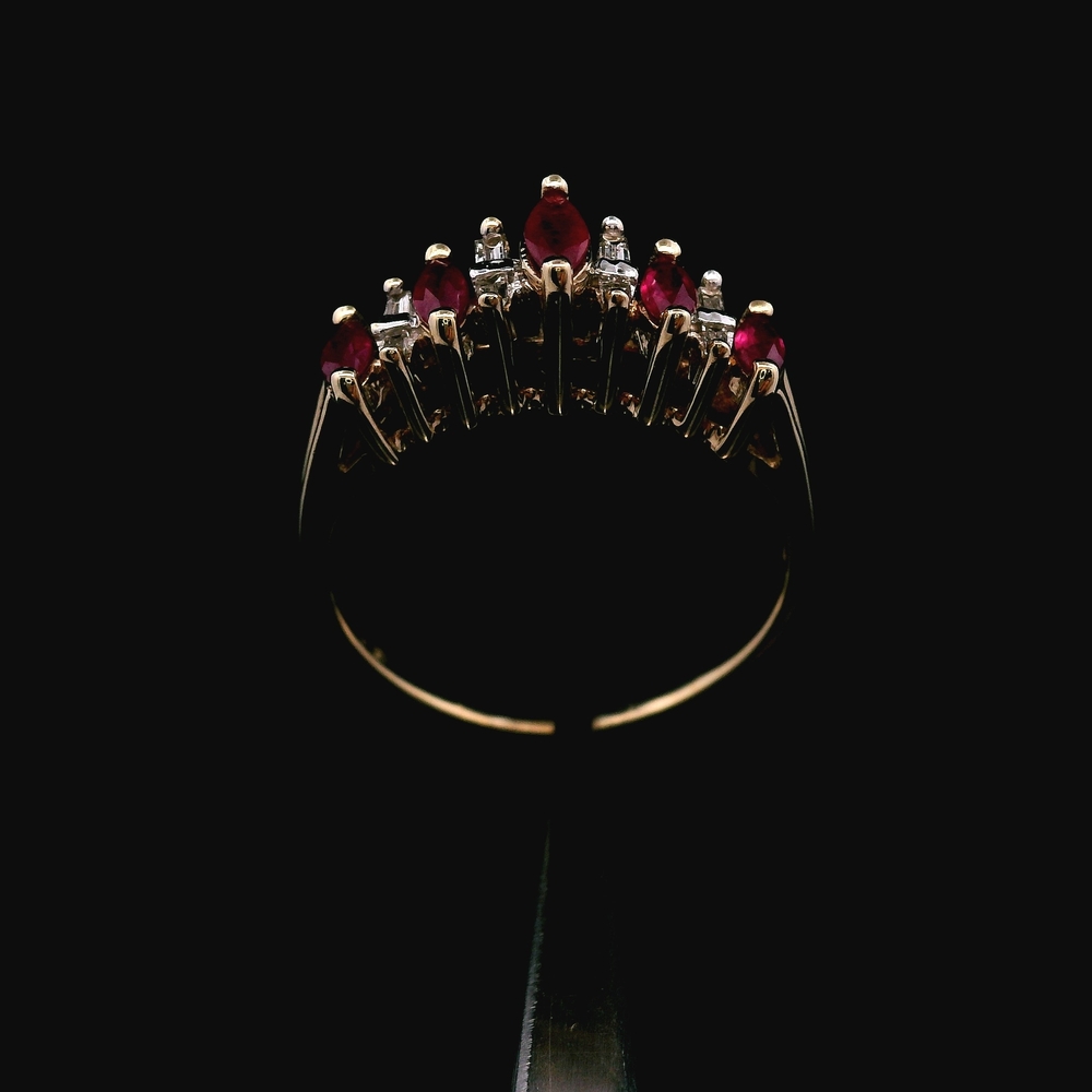 This charming ring is crafted in 10K yellow gold and features lovely Natural Rubies paired with approximately 0.04 ct (4 points) total weight of sparkling accent stones. It is a size 7.75 and has a total weight of 1.60 dwt (approximately 2.5 grams). The item is in good condition. Please review all photos closely to assess cosmetic condition and the natural characteristics of the stones as the item shown is the exact one you will receive. Please note: Price may vary depending on the price of gold and silver.