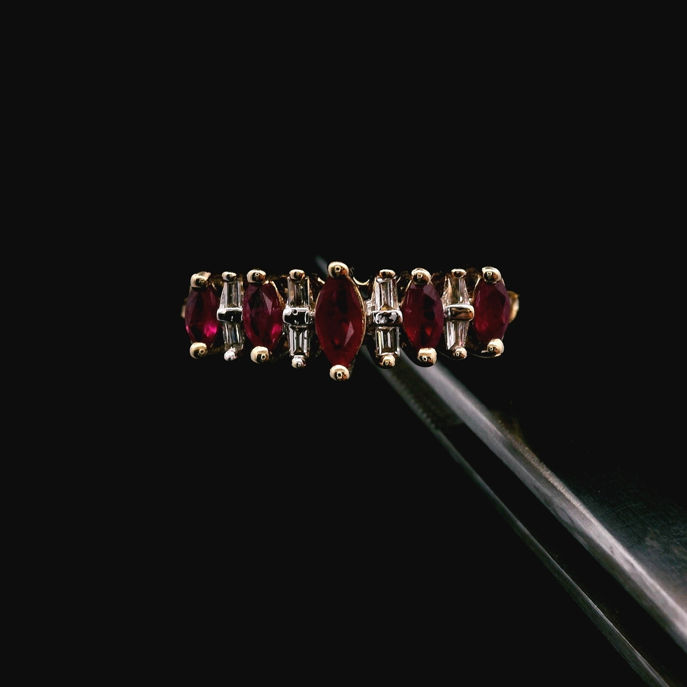 Descripción del Artículo: Este encantador anillo está elaborado en oro amarillo de 10K y presenta hermosos Rubíes Naturales emparejados con aproximadamente 0.04 ct (4 puntos) de peso total de piedras de acento brillantes. Es una talla 7.75 y tiene un peso total de 1.60 dwt (aproximadamente 2.5 gramos). El artículo está en buenas condiciones. Por favor revise todas las fotos detenidamente para evaluar la condición cosmética y las características naturales de las piedras, ya que el artículo que se muestra es exactamente el que recibirá. Tenga en cuenta: El precio puede variar dependiendo del precio del oro y la plata.