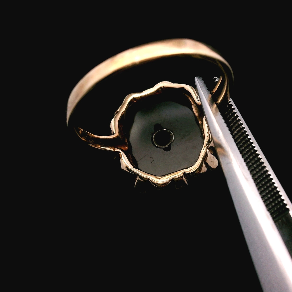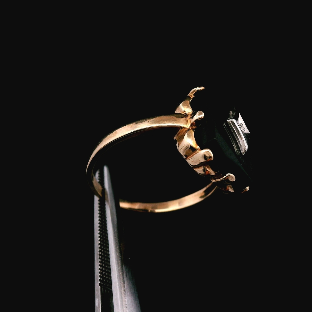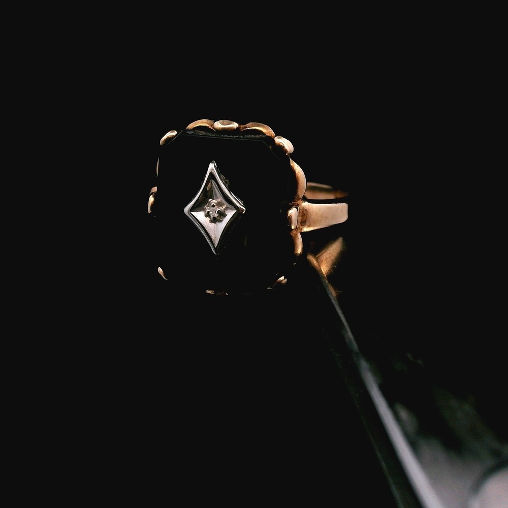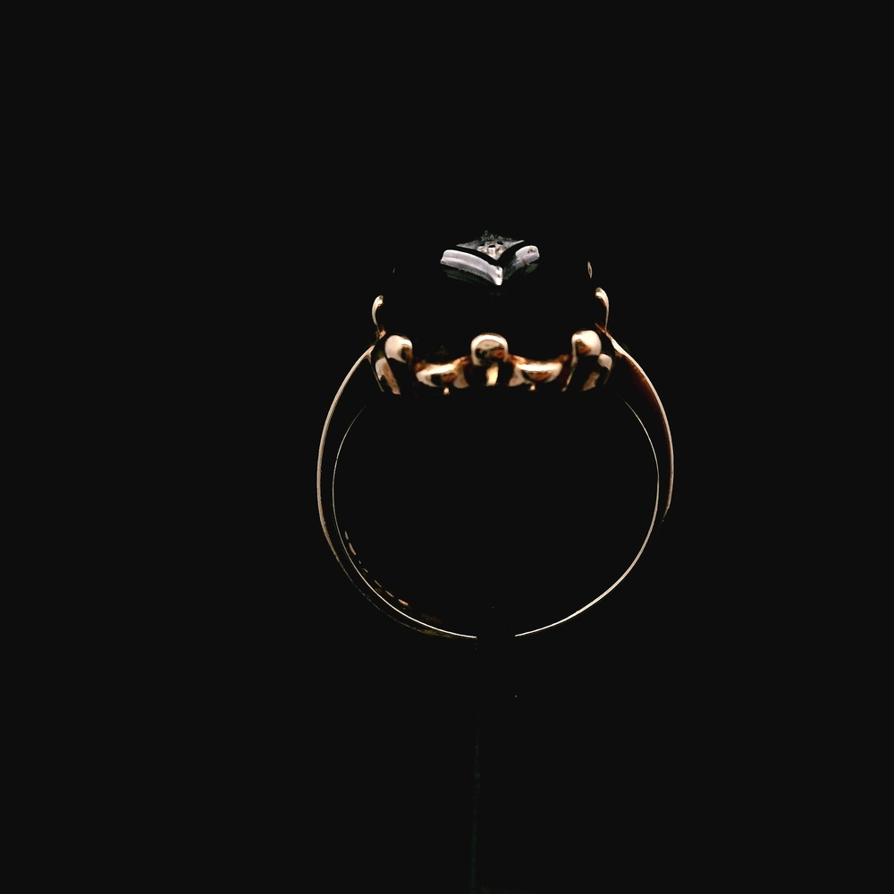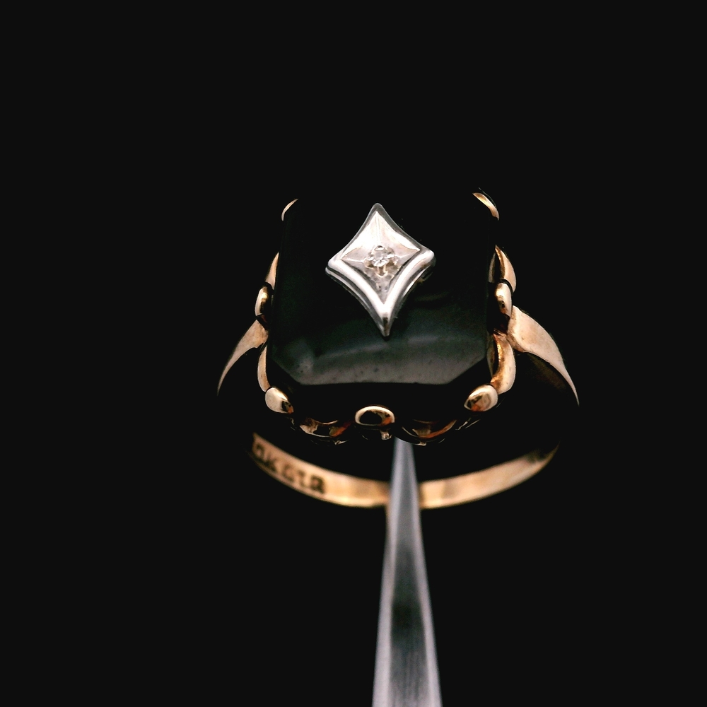 Item Description: This elegant ring is crafted in 10K yellow gold and features Onyx accented by Diamonds. It is a size 6 and has a total weight of 1.9 dwt (approximately 3.0 grams). The item is in good condition. Please review all photos closely to assess cosmetic condition and the natural characteristics of the stones as the item shown is the exact one you will receive. Please note: Price may vary depending on the price of gold and silver.