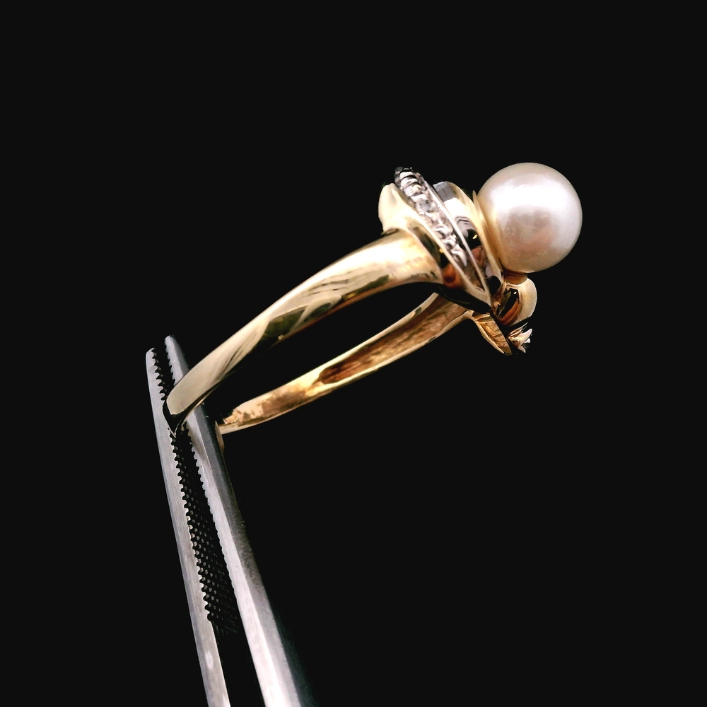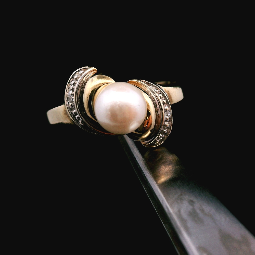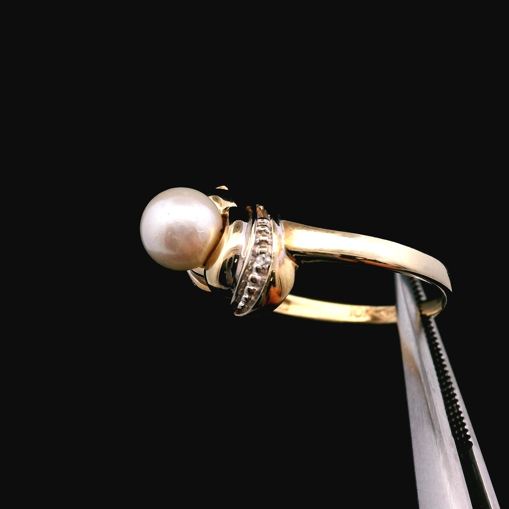 Item Description: This classic ring is crafted in 10K yellow gold and features a lustrous Pearl accented by sparkling Diamonds. It is a size 7.75 and has a total weight of 1.3 dwt (approximately 2.0 grams). The item is in good condition. Please review all photos closely to assess cosmetic condition and the natural characteristics of the stones as the item shown is the exact one you will receive. Please note: Price may vary depending on the price of gold and silver.