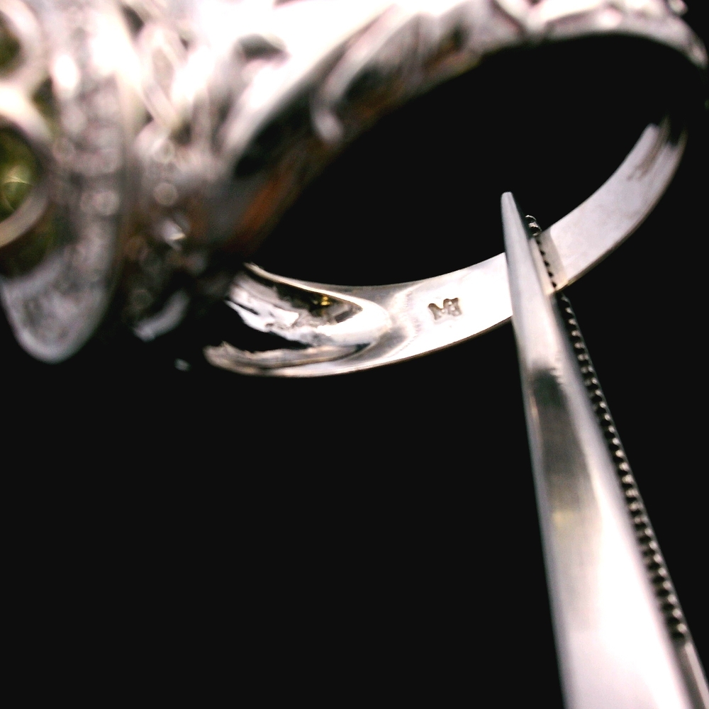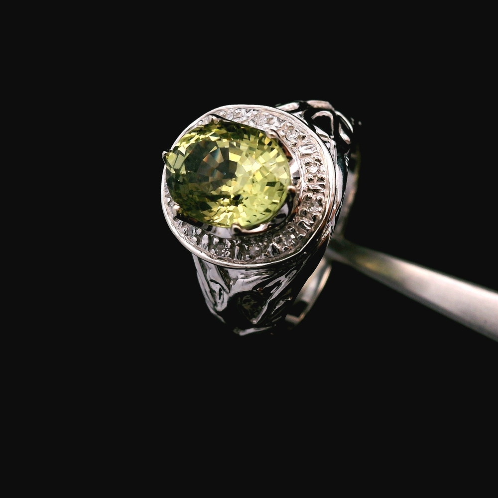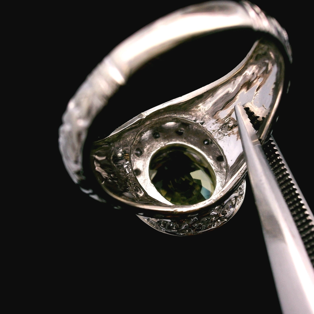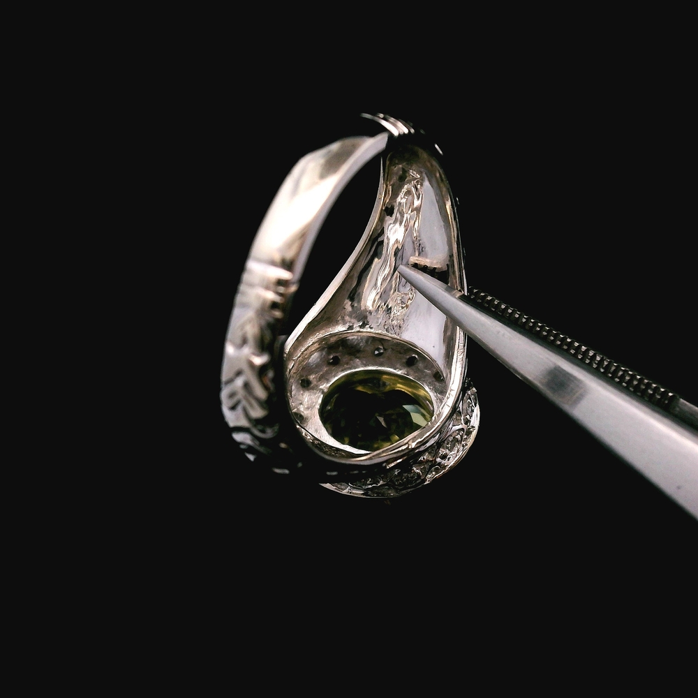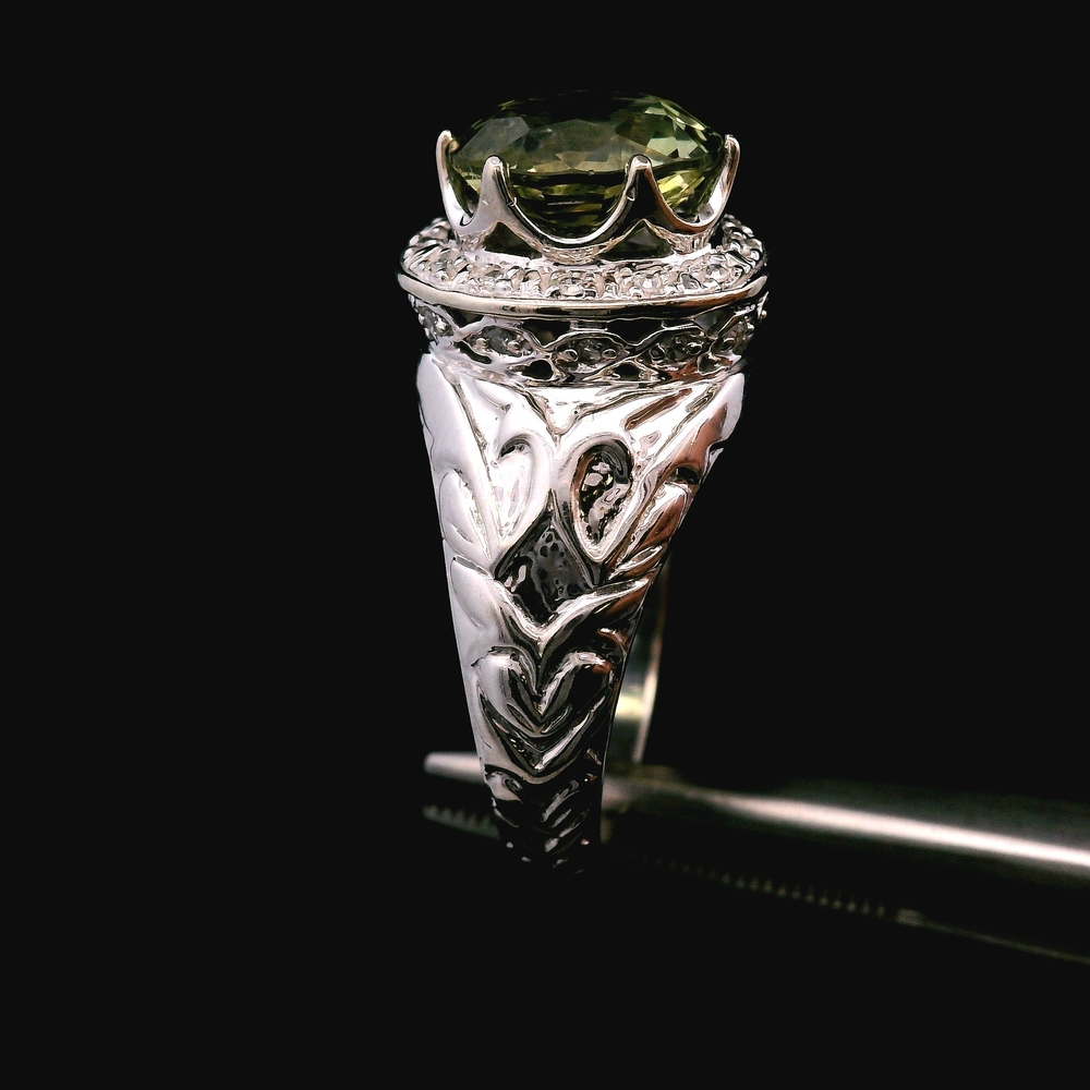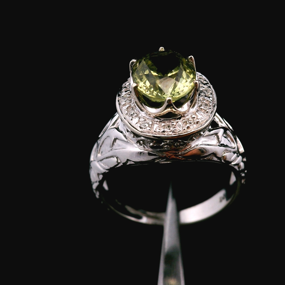Este anillo de oro blanco de 10KT presenta un peridoto vibrante acentuado con pequeñas esquirlas de diamante, todo en buena condición con señales normales de uso. Las piedras añaden un toque de color llamativo y la banda pulida ofrece un estilo clásico y limpio. Con un peso de 3.70dwt, tiene una sensación sólida sin ser pesado, y la talla 7 lo hace ideal para uso diario u ocasional. Una pieza encantadora que combina color y brillo.