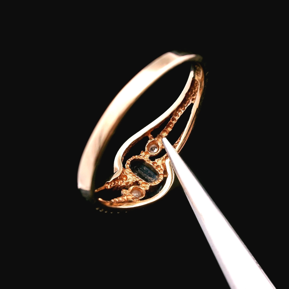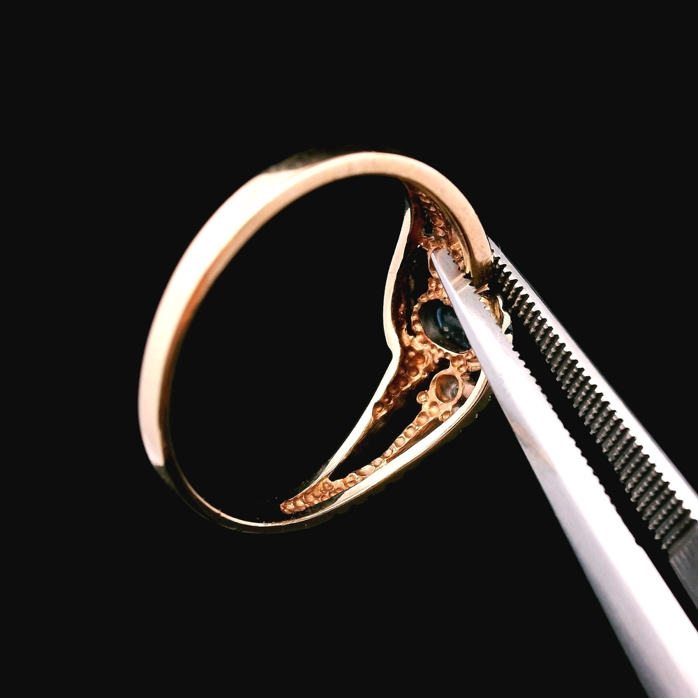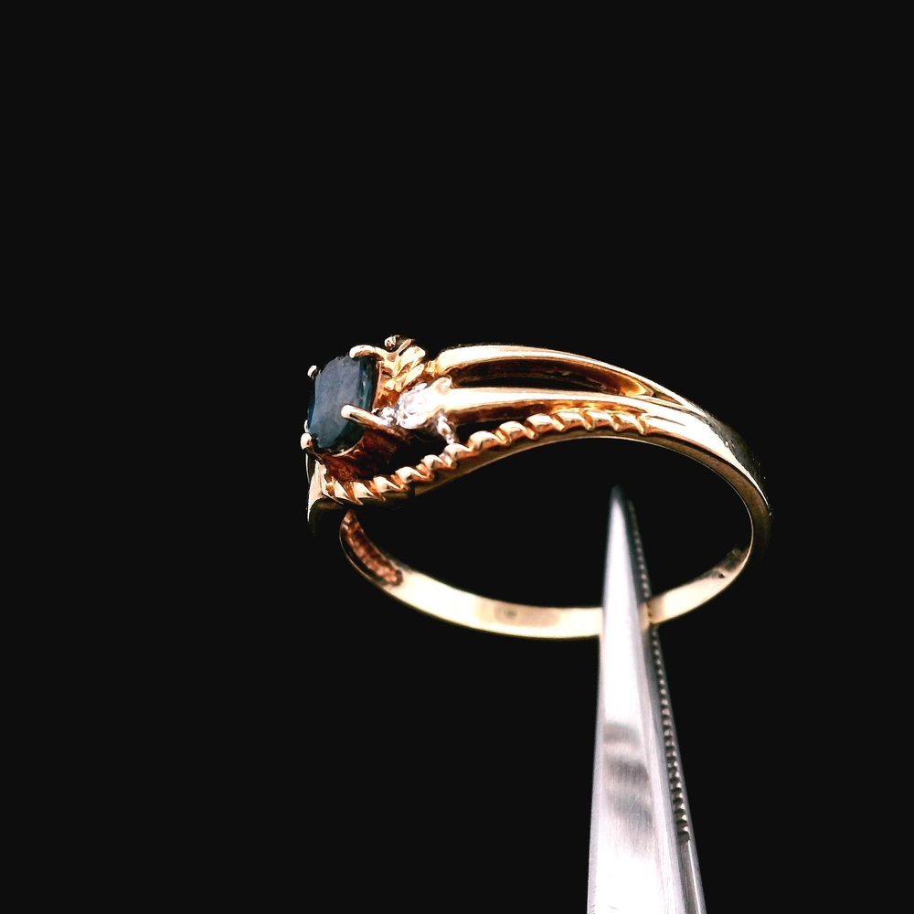 Este anillo de oro amarillo de 10KT presenta un zafiro acentuado por pequeños diamantes, en buena condición con ligeras señales de uso normal. El contraste entre el zafiro azul intenso y el oro brillante crea un estilo clásico que destaca sin ser llamativo en exceso. Con un peso de 1.1dwt, ofrece una sensación ligera y cómoda, ideal para uso diario. La talla 7 lo convierte en una pieza versátil para muchas colecciones.