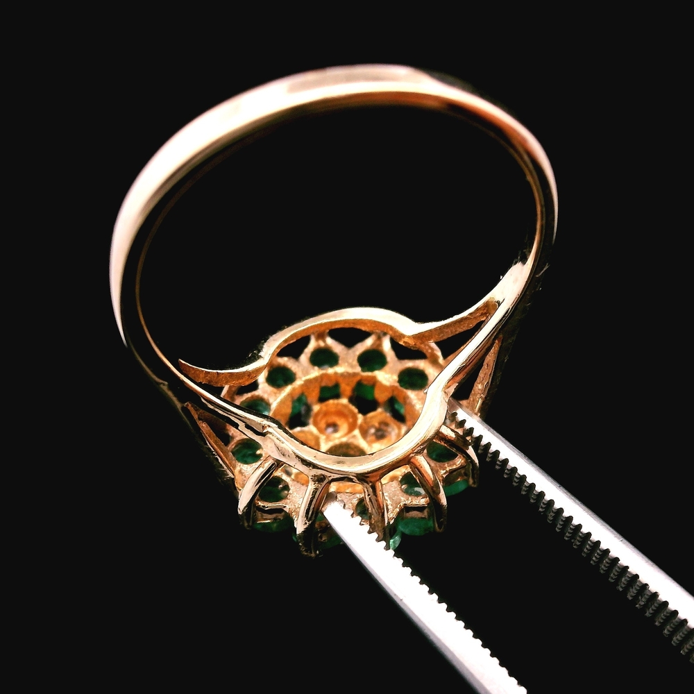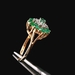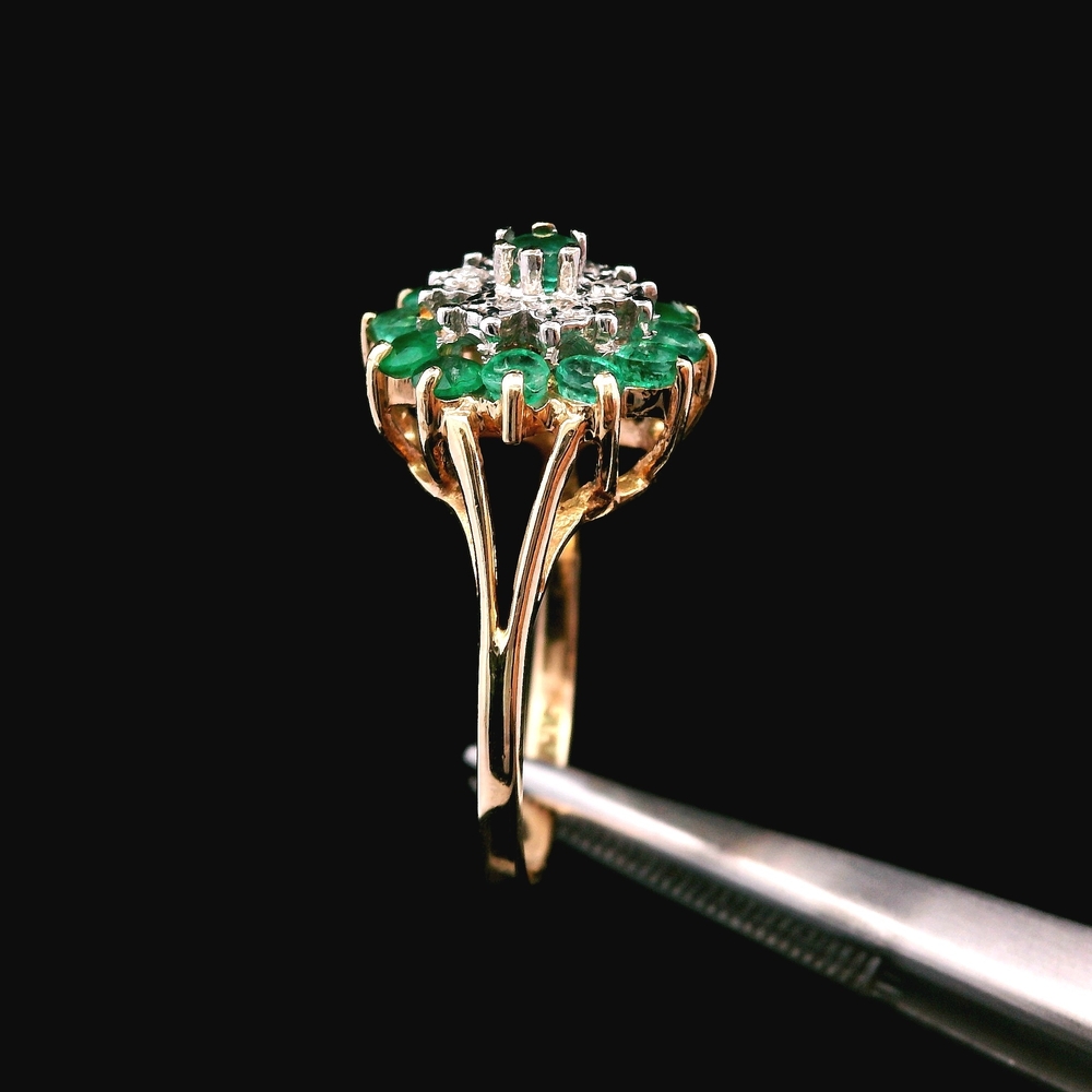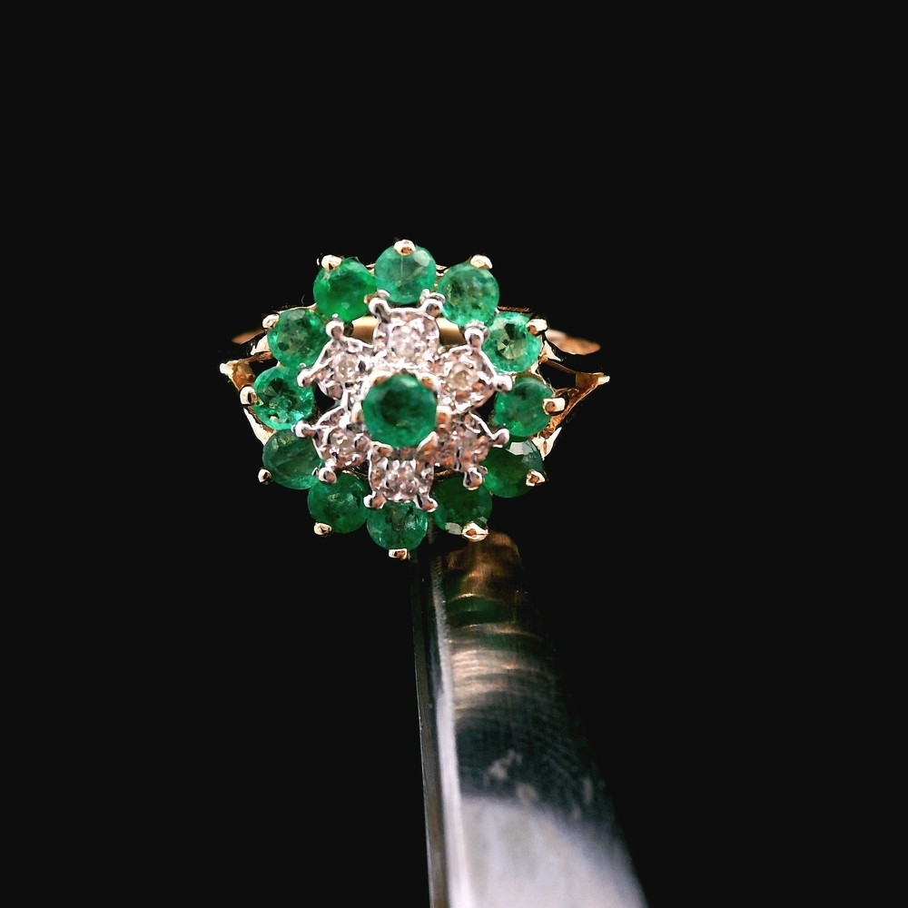 Este anillo de oro amarillo de 10KT presenta esmeraldas vívidas acentuadas con pequeños diamantes, en buena condición con ligeras señales de uso normal. Las esmeraldas de color verde intenso destacan muy bien contra el cálido oro amarillo, mientras que los diamantes añaden un brillo sutil. Con un peso de 1.7dwt, es ligero y cómodo para uso diario. La talla 5.75 ofrece una opción clásica y versátil para muchas colecciones.