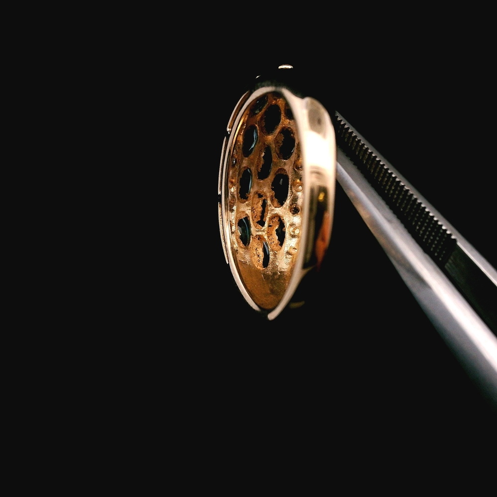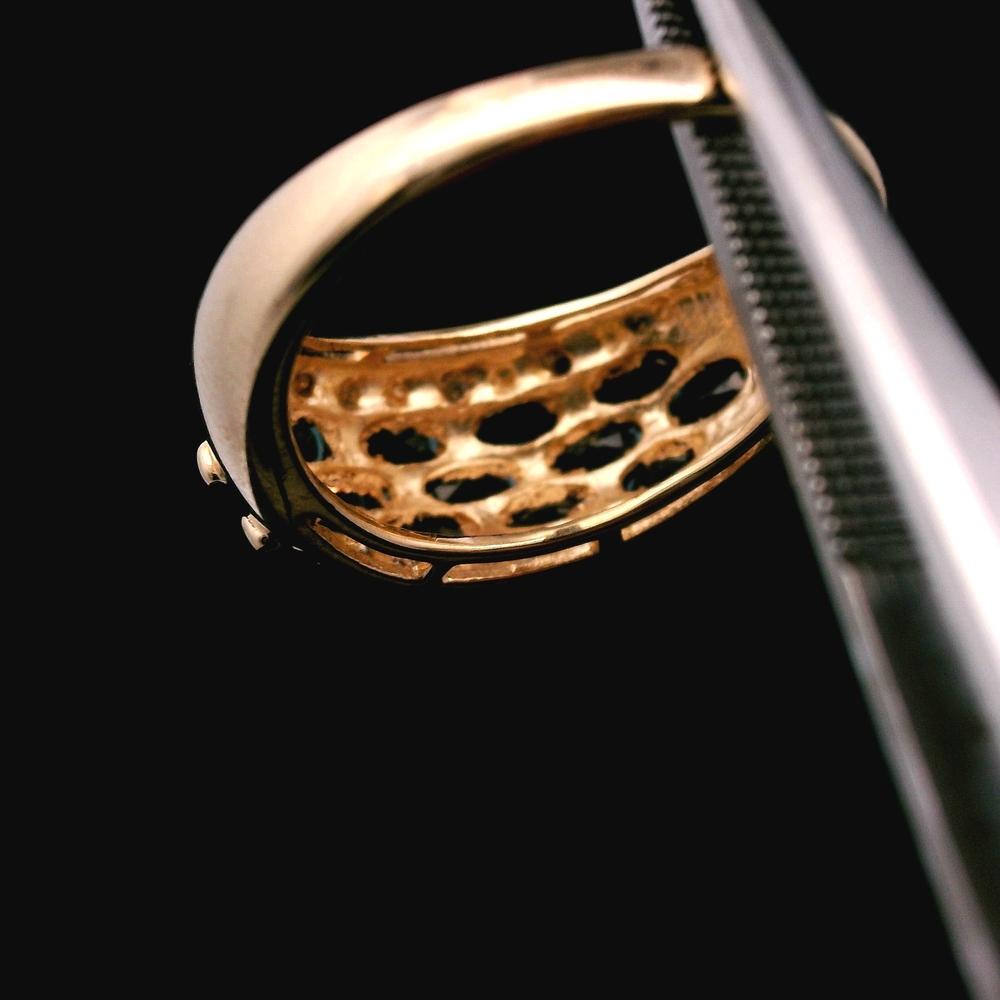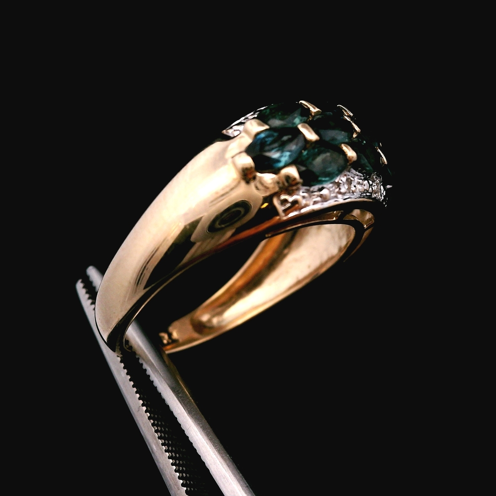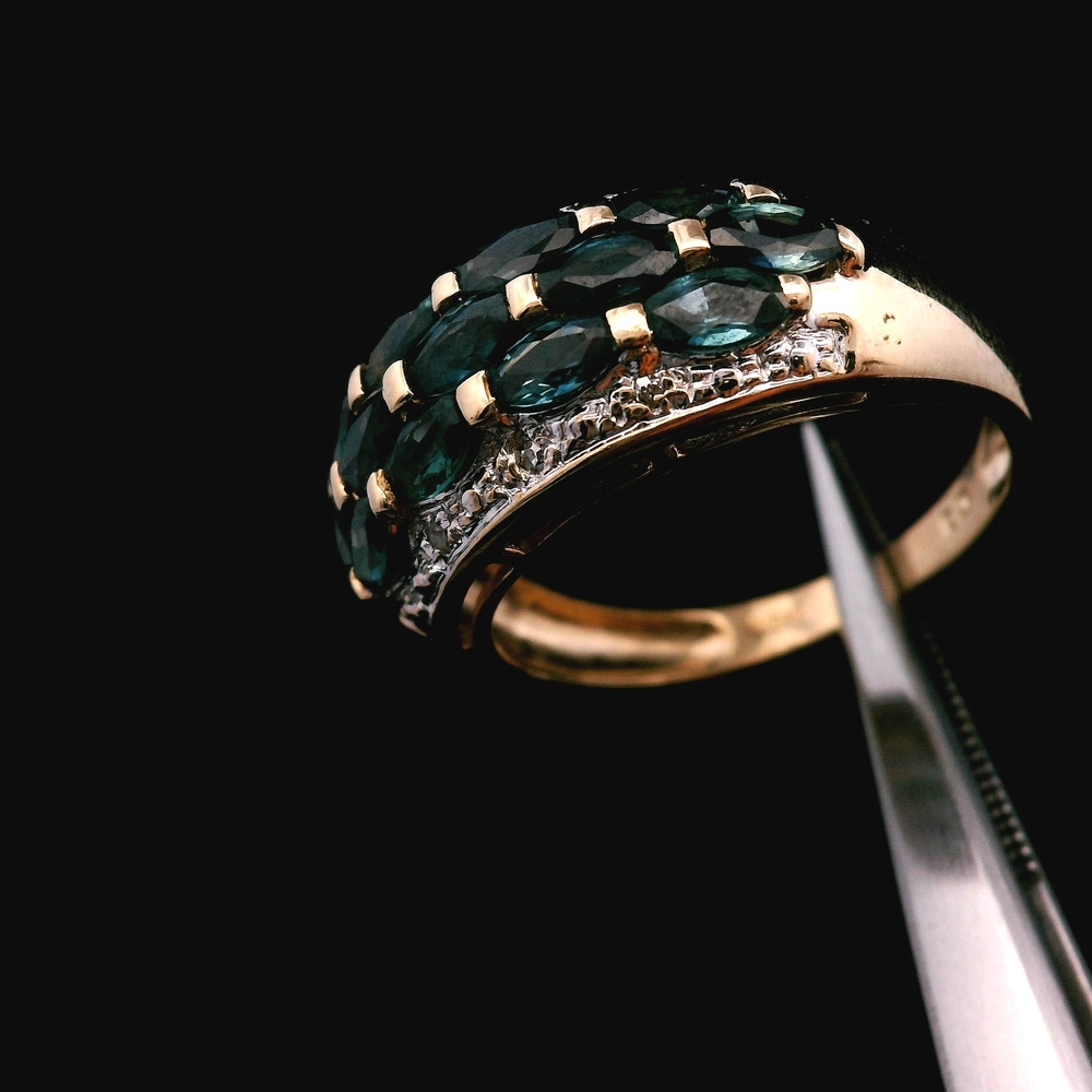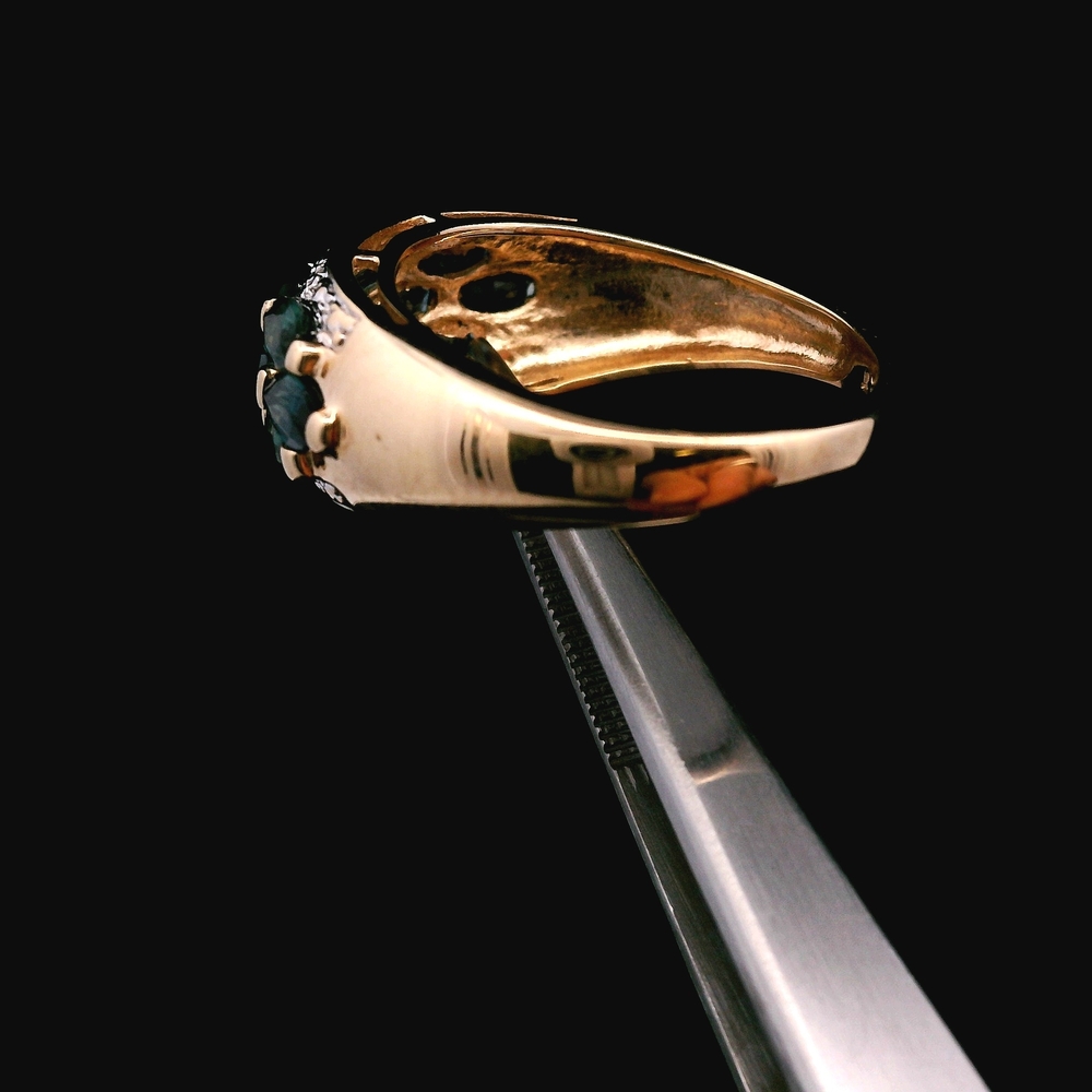 Este anillo de oro amarillo de 10KT presenta zafiros acentuados con pequeños diamantes, en buena condición con ligeras señales de uso normal. Los zafiros azul intenso contrastan perfectamente con el cálido oro amarillo, mientras que los diamantes añaden un toque sutil de brillo. Con un peso de 2.1dwt, tiene una sensación cómoda en la mano, y la talla 6.25 lo hace ideal para uso diario o para ocasiones especiales.