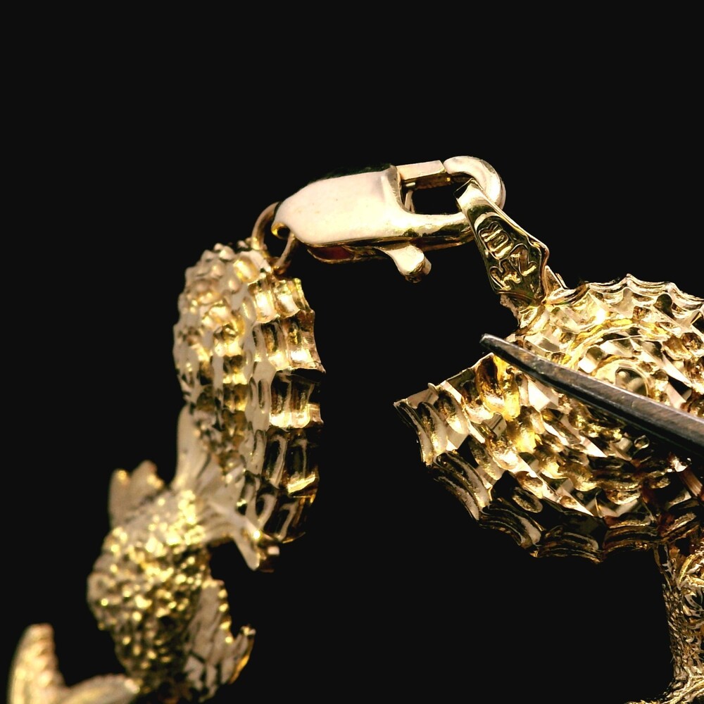 Este brazalete de oro amarillo de 10KT presenta un diseño detallado de criaturas marinas, aportando un toque único y artístico a una pieza clásica de joyería. Con una longitud de 7 pulgadas, está diseñado para ajustarse cómodamente a la muñeca mientras muestra sus motivos inspirados en el mar. Con un peso de 12.30 DWT (19.141 gramos), tiene una presencia sustancial que combina elegancia con creatividad. Viene con una caja de joyería genérica.