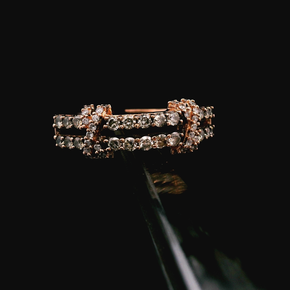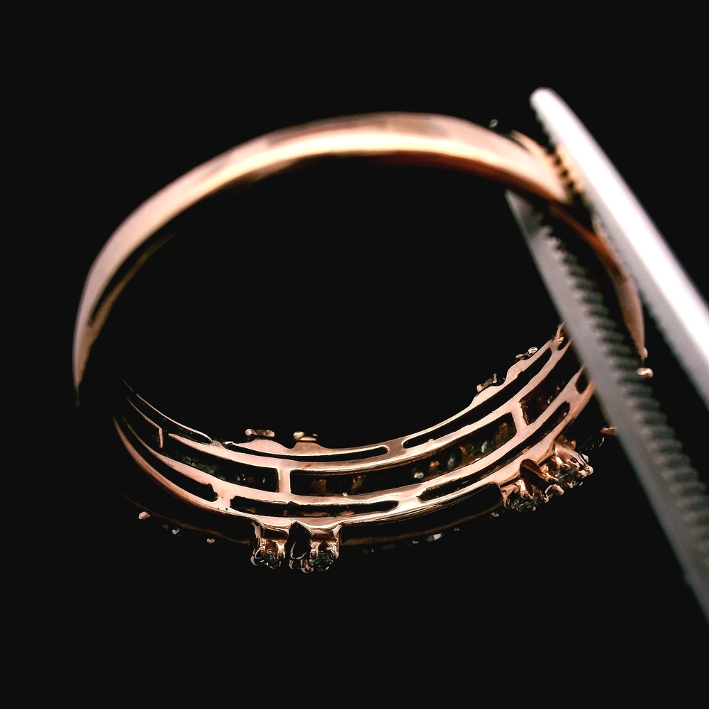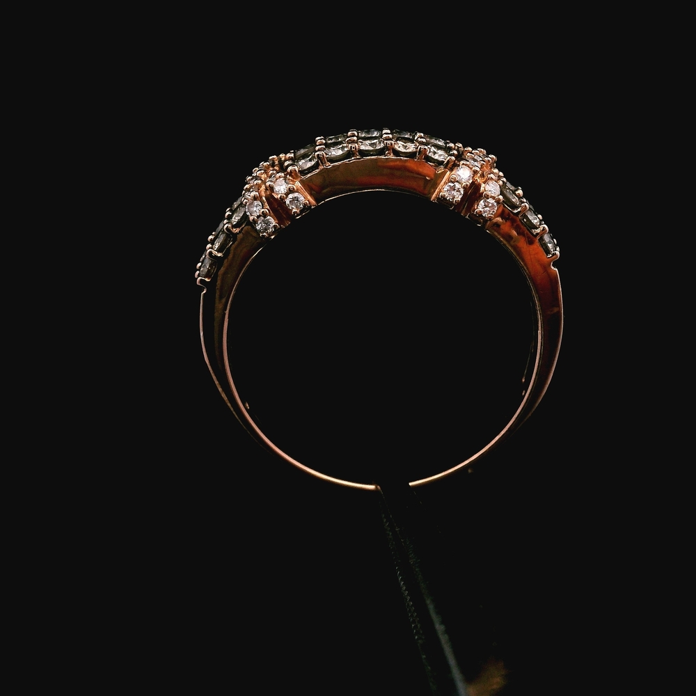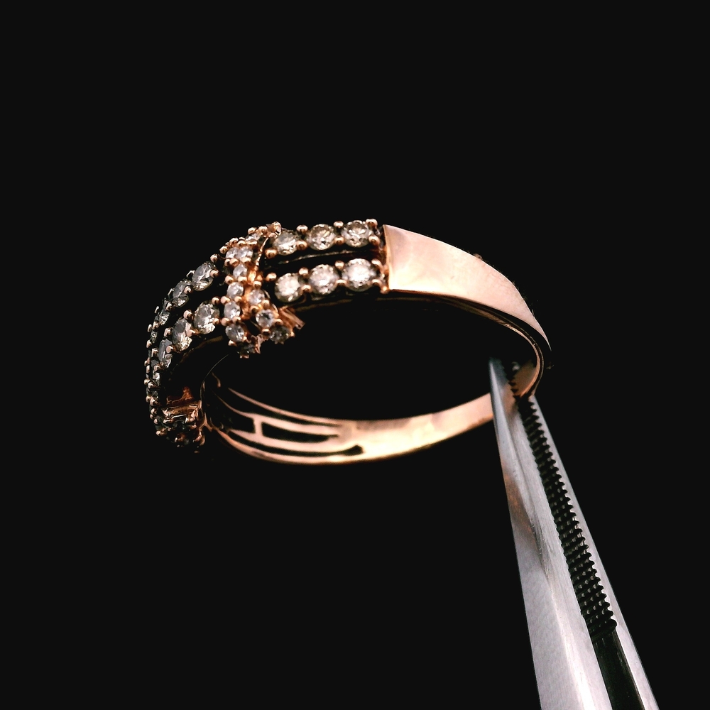 Item Description: This beautiful band ring is crafted in 14K rose gold and features approximately 0.30 CTTW (30 points) of diamonds. It is a size 8.25 and has a total weight of 2.10 dwt (approximately 3.3 grams). The item is in good condition. Please review all photos closely to assess cosmetic condition and the natural characteristics of the stones as the item shown is the exact one you will receive. Please note: Price may vary depending on the price of gold and silver.