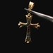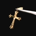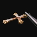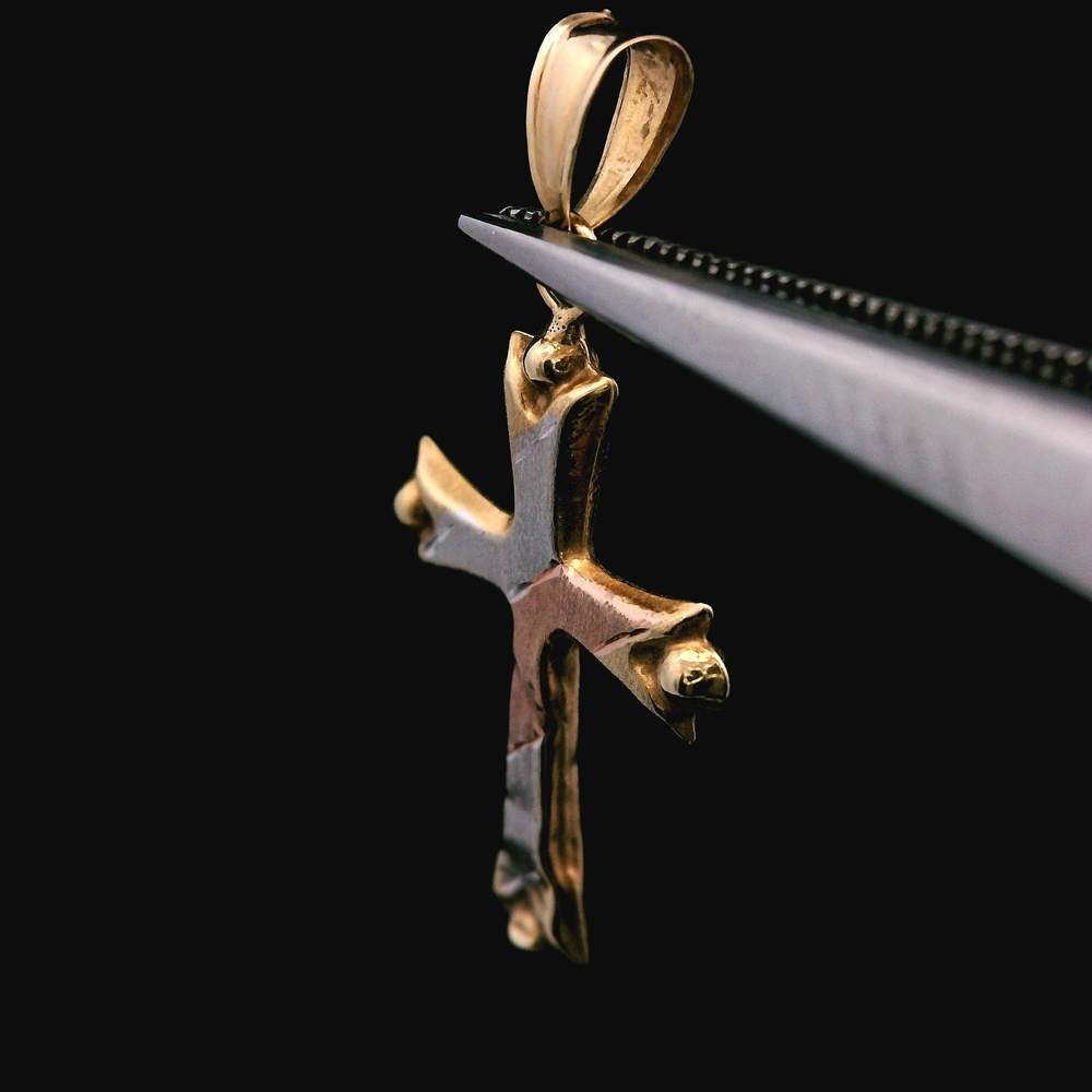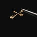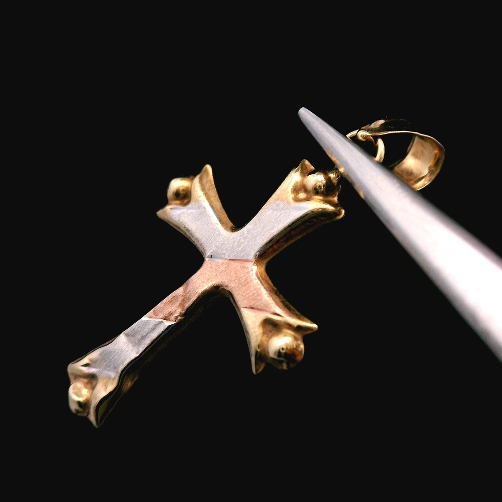 This petite cross pendant is crafted in 14K tricolor gold, featuring a beautiful combination of yellow, white, and rose gold hues. The total weight is 0.20 dwt (approximately 0.3 grams). The item is in good condition. Please review all photos closely to assess cosmetic condition as the item shown is the exact one you will receive. Please note: Price may vary depending on the price of gold and silver.