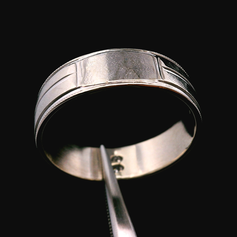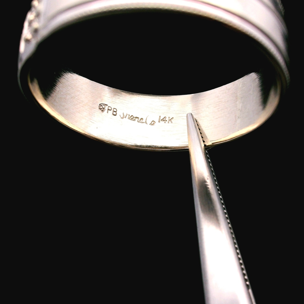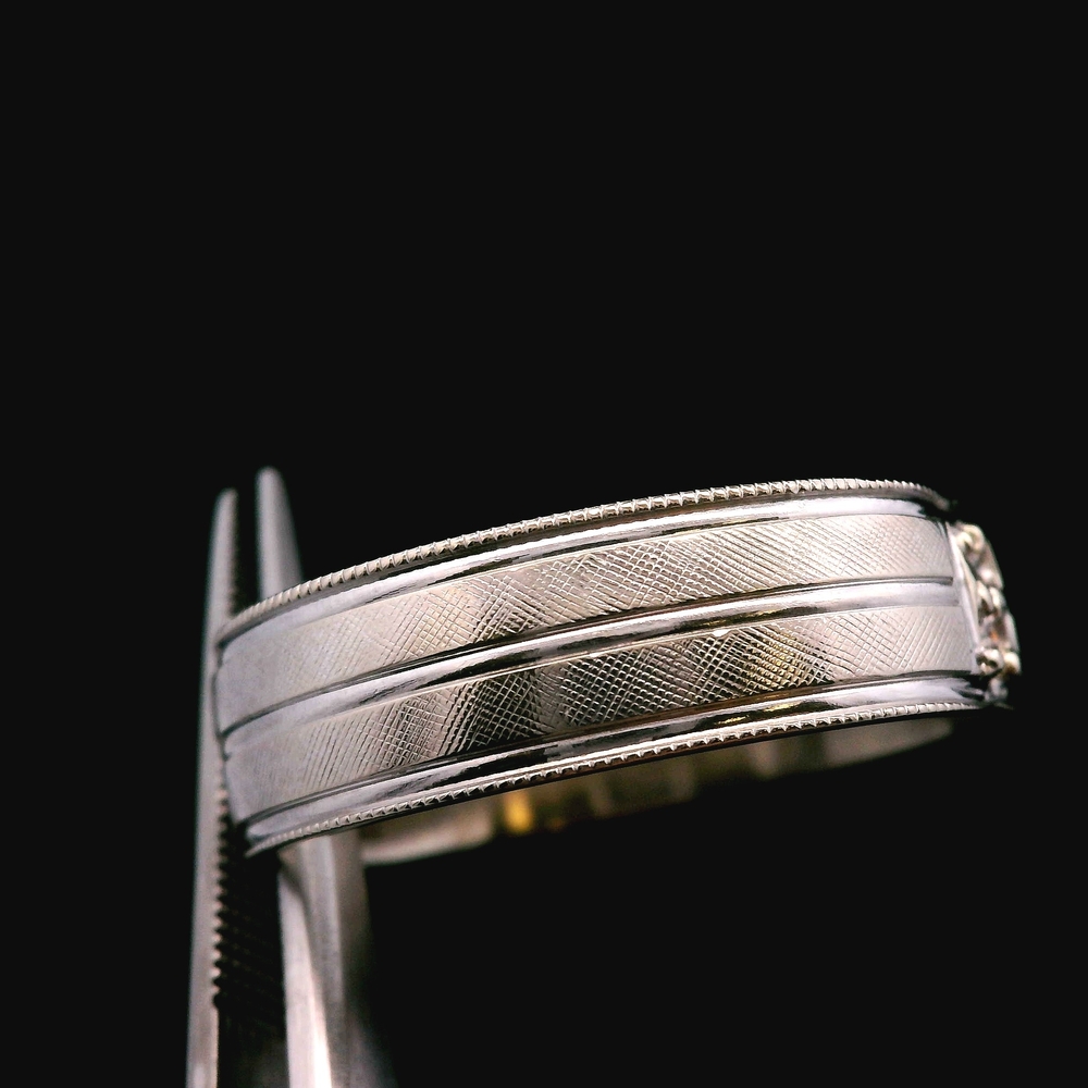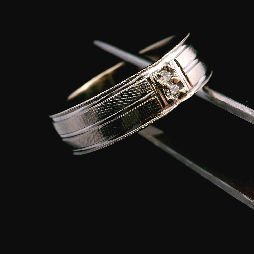 Este anillo sólido está elaborado en oro blanco de 14K y cuenta con aproximadamente 0.06 quilates (6 puntos) de peso total de acentos de diamantes. Es talla 6 y tiene un peso total sustancial de 4.20 dwt (aproximadamente 6.5 gramos). El artículo está en buenas condiciones. Por favor revise todas las fotos detenidamente para evaluar la condición cosmética, ya que el artículo que se muestra es exactamente el que recibirá. Tenga en cuenta: El precio puede variar dependiendo del precio del oro y la plata.