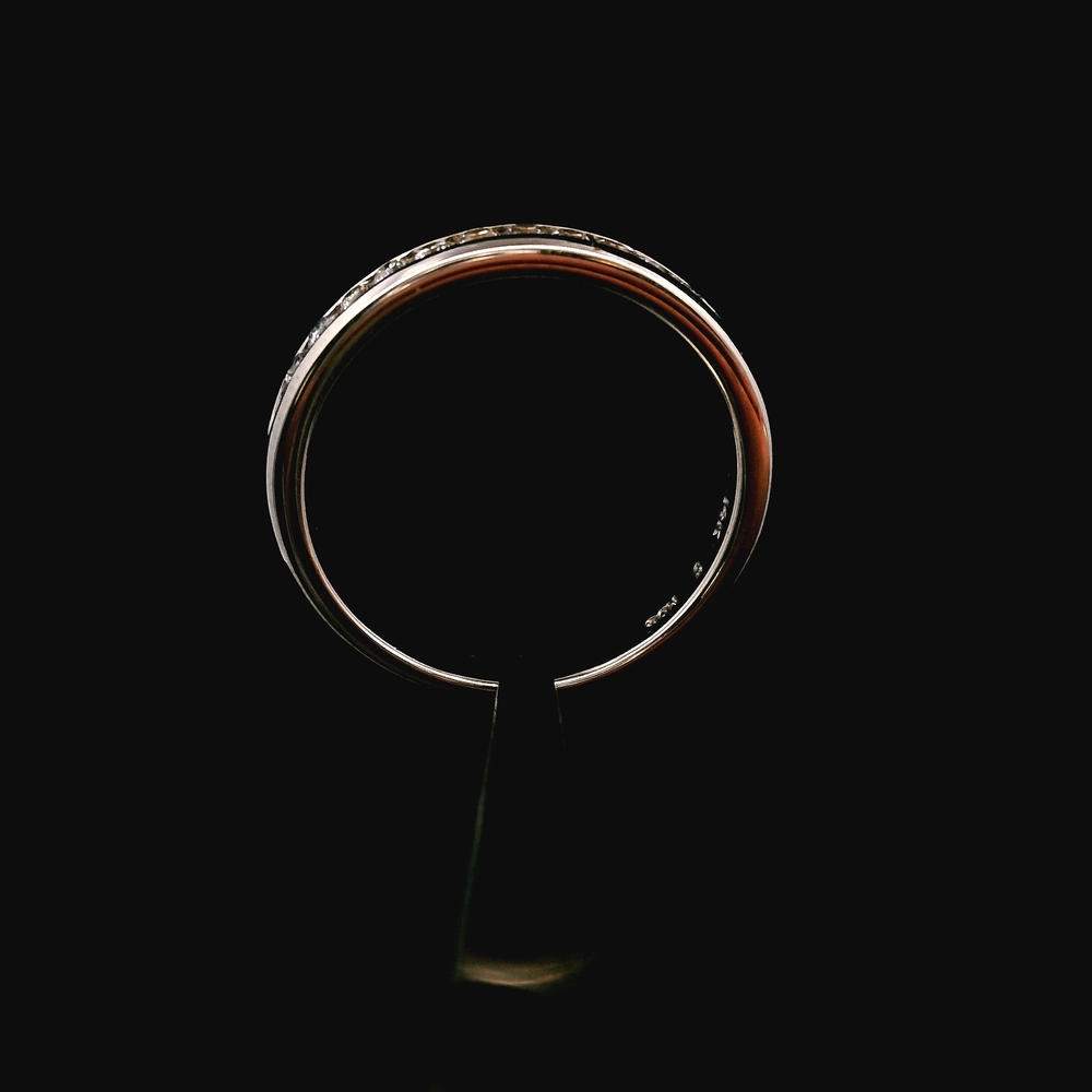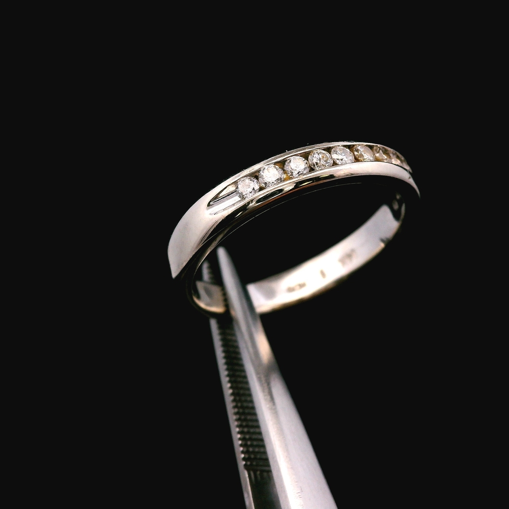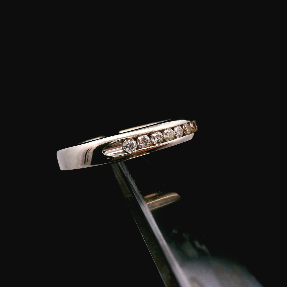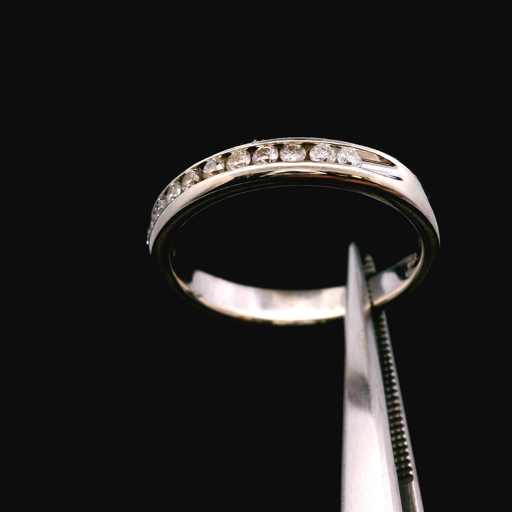 Este encantador anillo está elaborado en oro blanco de 14K y presenta diamantes brillantes con un total de aproximadamente 0.12 quilates (12 puntos). Es talla 6 y tiene un peso total de 1.9 dwt (aproximadamente 3.0 gramos). El artículo está en buenas condiciones. Por favor revise todas las fotos detenidamente para evaluar la condición cosmética, ya que el artículo que se muestra es exactamente el que recibirá. Tenga en cuenta: El precio puede variar dependiendo del precio del oro y la plata.