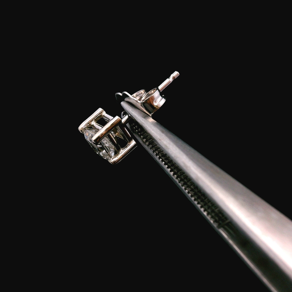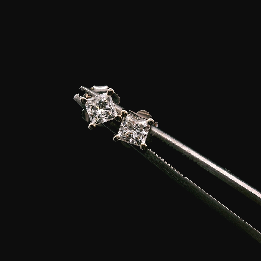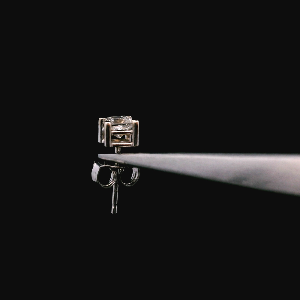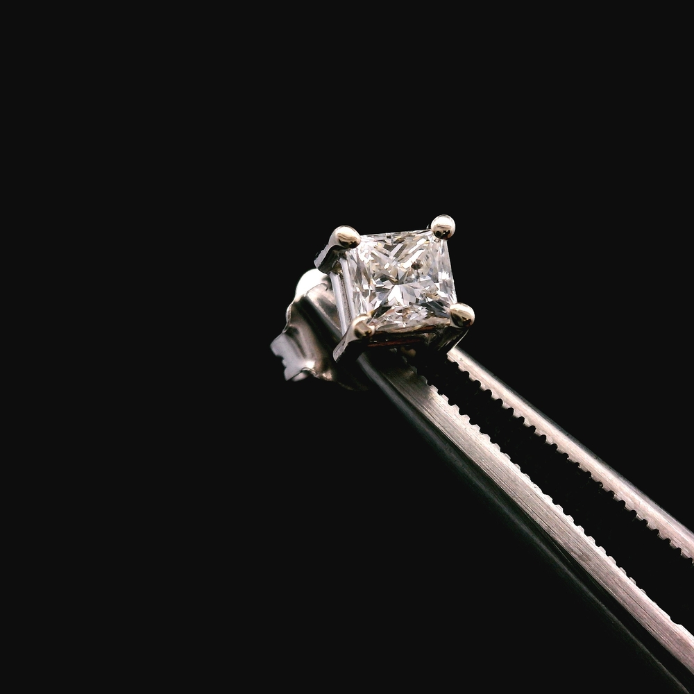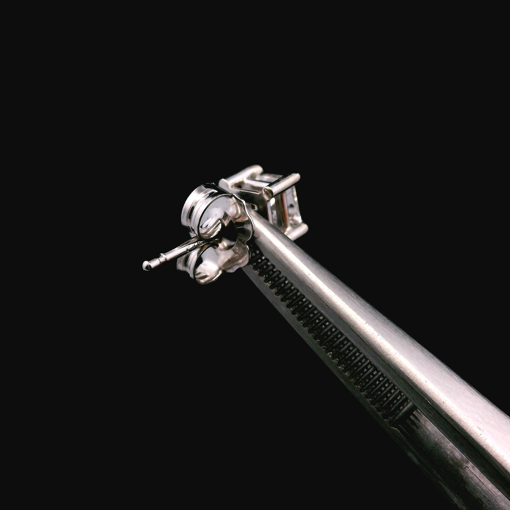 These sparkling stud earrings are crafted in 14K white gold and feature approximately 0.60 carats (60 points) total weight of diamonds. They offer a classic solitaire look perfect for daily wear or special occasions. The total weight is 0.60 dwt (approximately 0.9 grams). The item is in good condition. Please review all photos closely to assess cosmetic condition as the item shown is the exact one you will receive. Please note: Price may vary depending on the price of gold and silver.