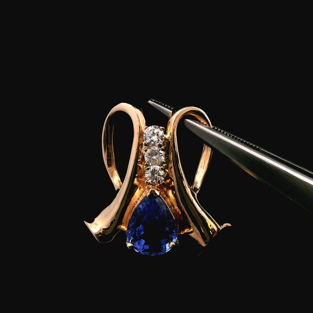 This exquisite piece of fine jewelry is a 14KT Yellow Gold pendant featuring a vibrant 2.50-carat Tanzanite gemstone. The striking violet-blue center stone is elegantly framed by approximately 0.27 carats of sparkling diamond accents, creating a sophisticated look. Main Stone: 2.5 CT Tanzanite Accent Stones: Diamonds (approx. 0.27 cttw) Weight: 3.40 dwt (approx. 5.29 grams) The item is in good condition. Please review all photos closely to assess cosmetic condition, stone color/clarity, and hallmarks as the item shown is the exact one you will receive.