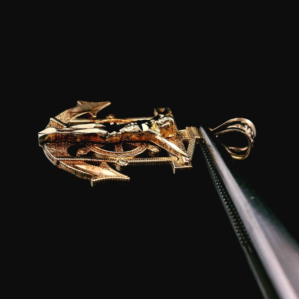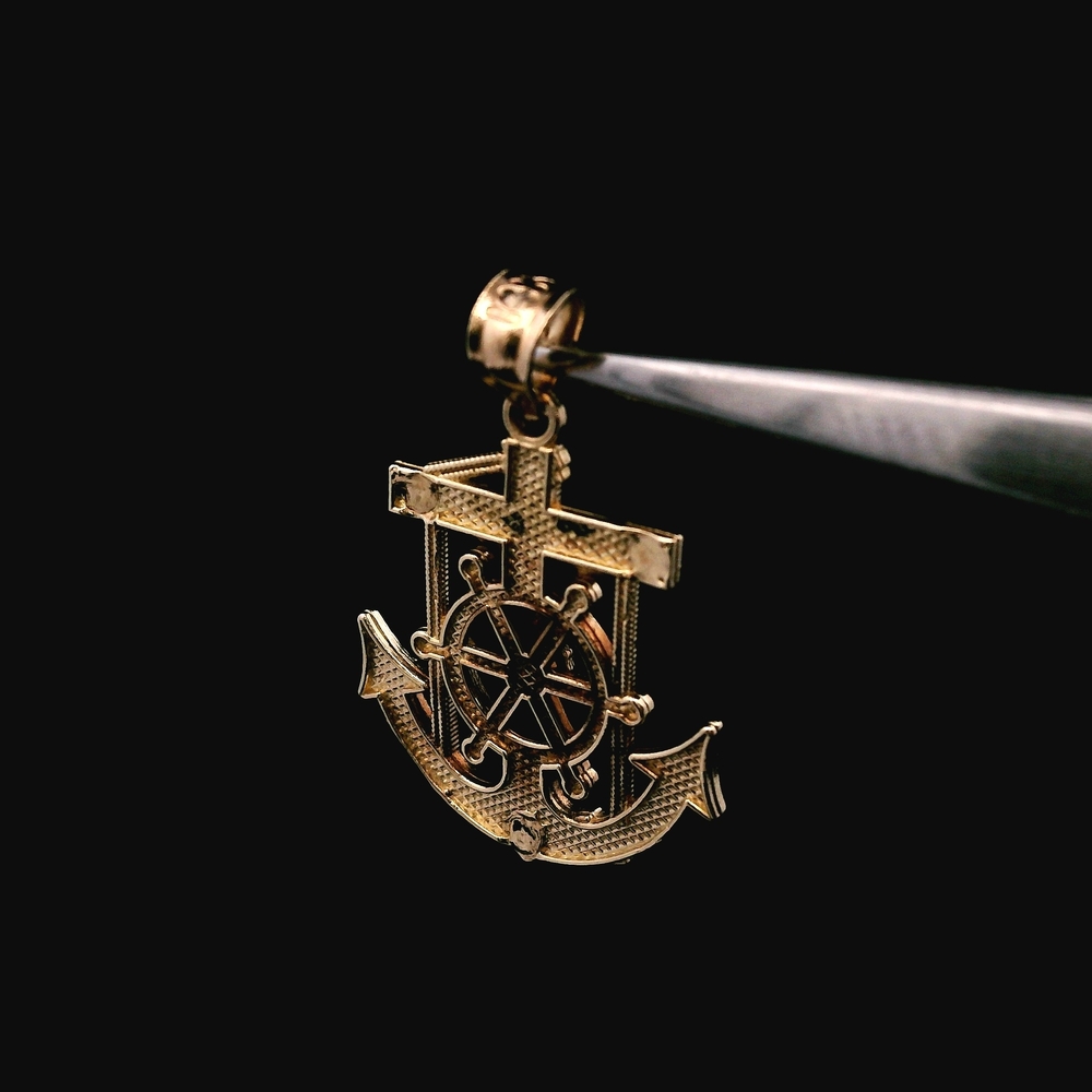 This symbolic pendant is crafted in 14K yellow gold and features a combined anchor and cross design, often representing hope and faith. The piece is suitable for a chain or charm bracelet. The total weight is 1.3 dwt (approximately 2.0 grams). The item is in good condition. Please review all photos closely to assess cosmetic condition as the item shown is the exact one you will receive. Please note: Price may vary depending on the price of gold and silver.