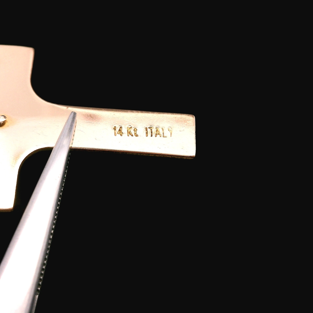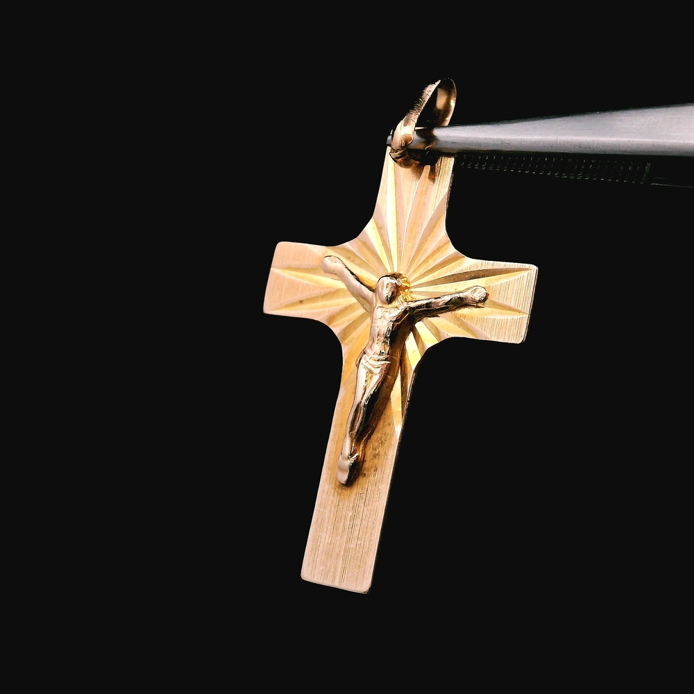 This classic and reverent piece of fine jewelry is a 14KT Yellow Gold Crucifix pendant featuring a detailed corpus of Jesus. It is a timeless symbol of faith and devotion, substantial enough to be worn daily on a chain. Design: Crucifix / Jesus on Cross Weight: 1.70 dwt (approx. 2.64 grams) The item is in good condition. Please review all photos closely to assess cosmetic condition, the detail of the figure, and hallmarks as the item shown is the exact one you will receive.