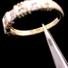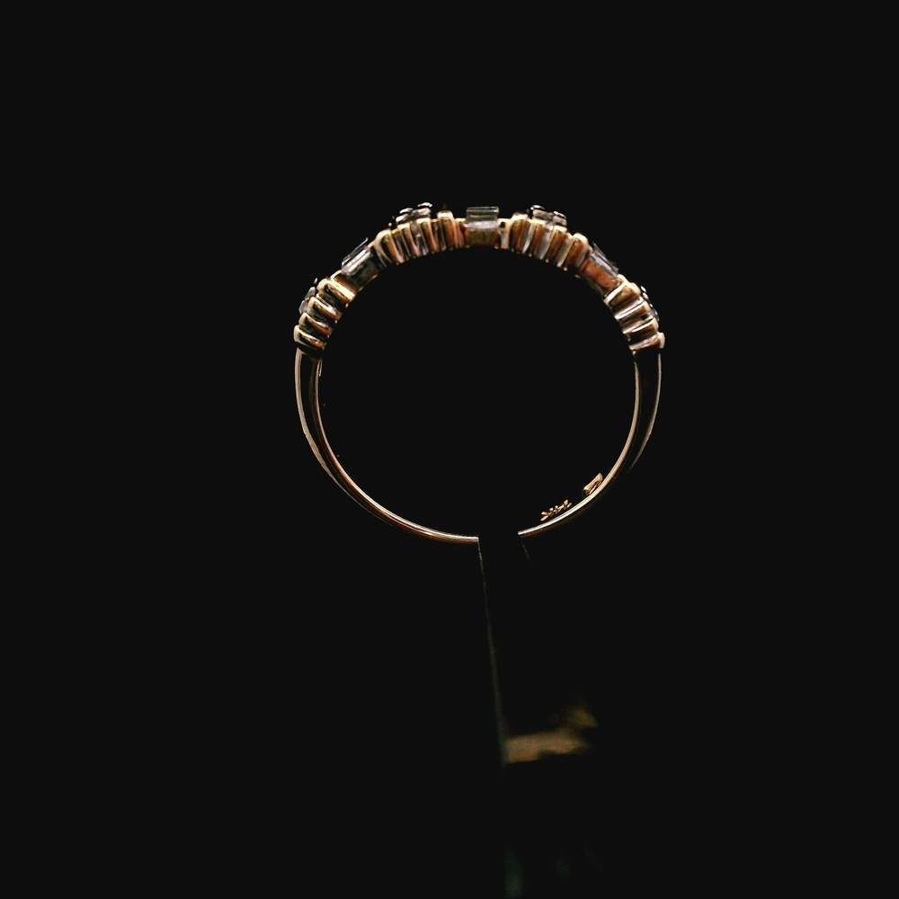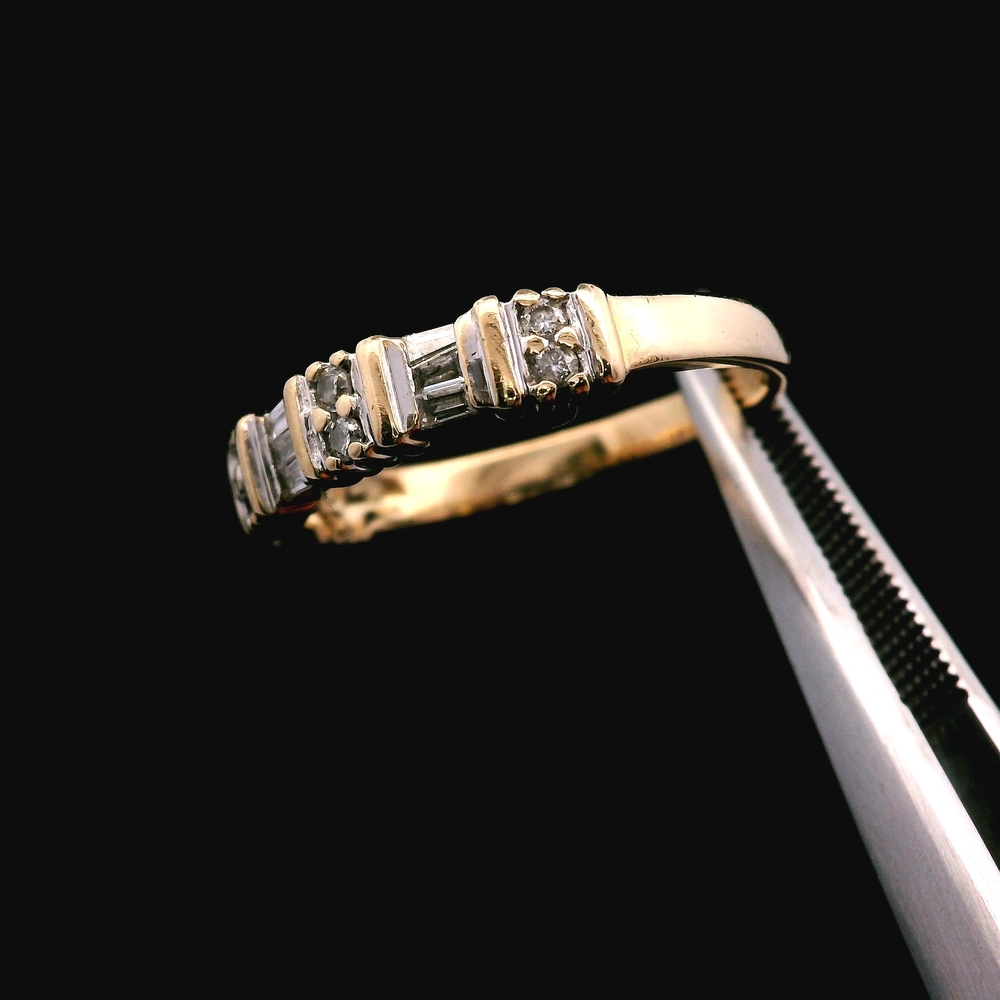 Este encantador anillo de banda está elaborado en oro amarillo de 14K y presenta un delicado arreglo de diamantes con un total de aproximadamente 0.14 quilates (14 puntos). Es talla 5.5 y tiene un peso total de 1.50 dwt (aproximadamente 2.3 gramos). El artículo está en buenas condiciones. Por favor revise todas las fotos detenidamente para evaluar la condición cosmética, ya que el artículo que se muestra es exactamente el que recibirá. Tenga en cuenta: El precio puede variar dependiendo del precio del oro y la plata.