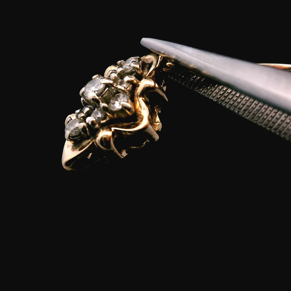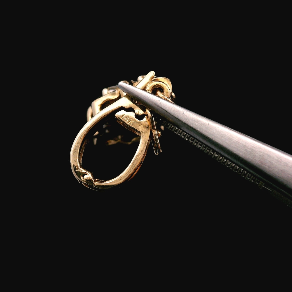 Este elegante dije está elaborado en oro amarillo de 14K y brilla con aproximadamente 1/5 de quilate de peso total de diamantes. Presenta un diseño clásico adecuado para usar en una cadena de collar. El peso total es de 1.7 dwt (aproximadamente 2.6 gramos). El artículo está en buenas condiciones. Por favor revise todas las fotos detenidamente para evaluar la condición cosmética, ya que el artículo que se muestra es exactamente el que recibirá. Tenga en cuenta: El precio puede variar dependiendo del precio del oro y la plata.