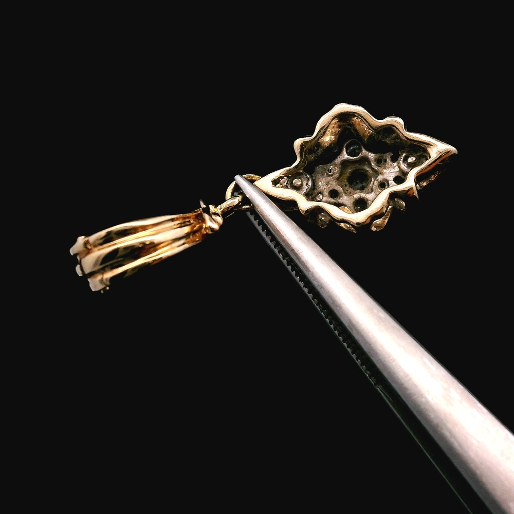 This elegant pendant is crafted in 14K yellow gold and sparkles with approximately 1/5 carat total weight of diamonds. It features a classic design suitable for wearing on a necklace chain. The total weight is 1.7 dwt (approximately 2.6 grams). The item is in good condition. Please review all photos closely to assess cosmetic condition as the item shown is the exact one you will receive. Please note: Price may vary depending on the price of gold and silver.