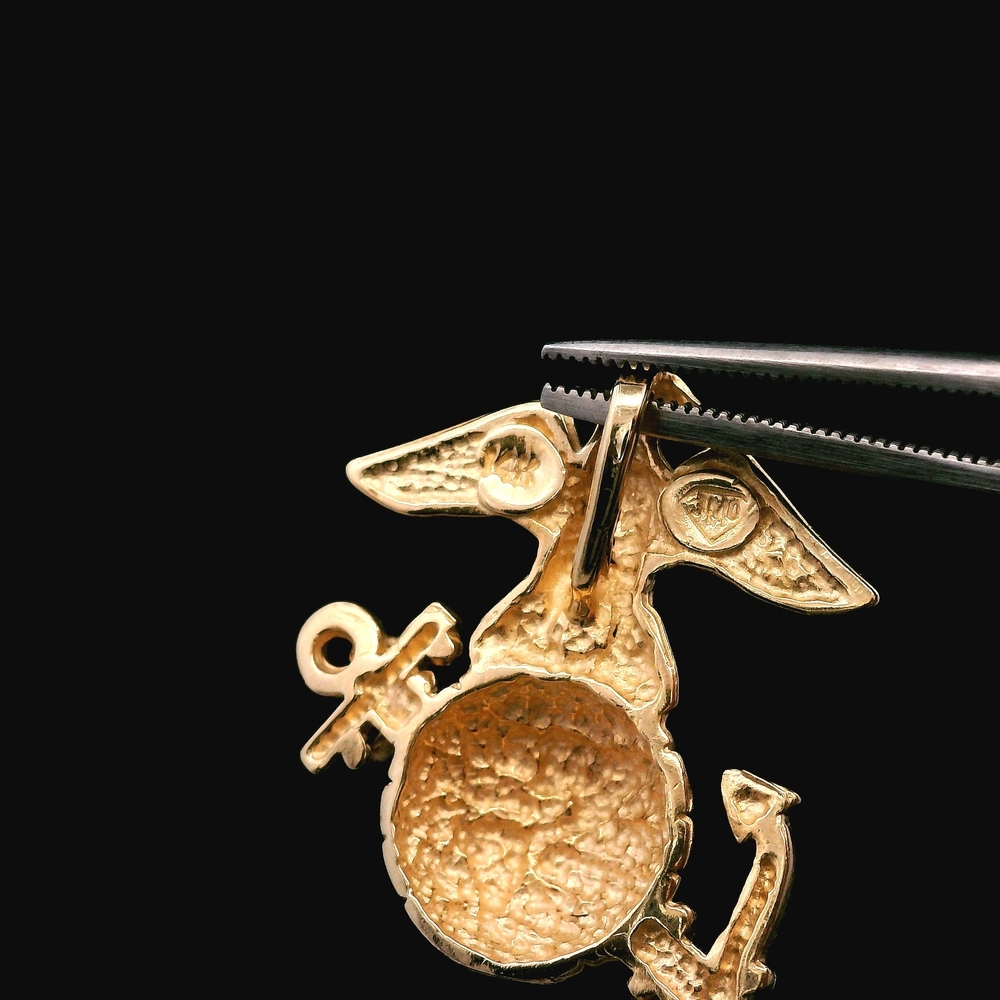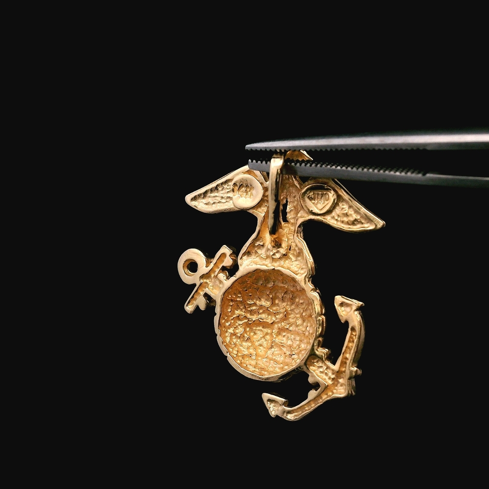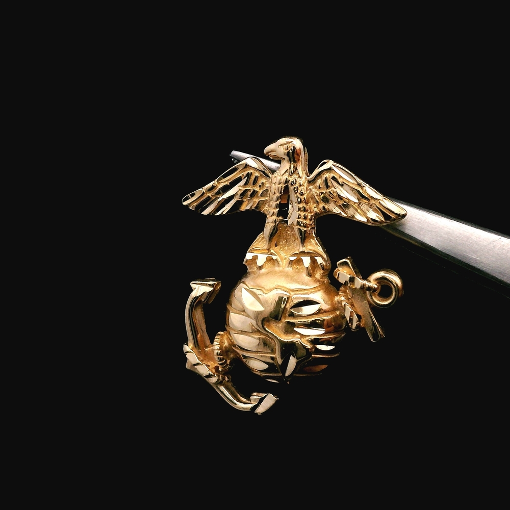 This honorable piece of fine jewelry is a 14KT Yellow Gold pendant/charm featuring the Marine Corps (USMC) emblem. Crafted with detail, this solid piece weighs 2.90 dwt (approximately 4.51 grams), making it a substantial and meaningful accessory for a veteran or supporter. Material: 14KT Yellow Gold Design: Marine Corps / USMC Type: Pendant / Charm Weight: 2.90 dwt (approx. 4.51 grams) The item is in good condition. Please review all photos closely to assess cosmetic condition and hallmarks as the item shown is the exact one you will receive.