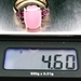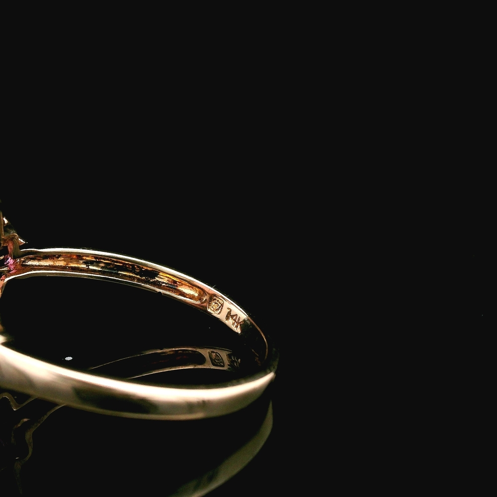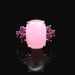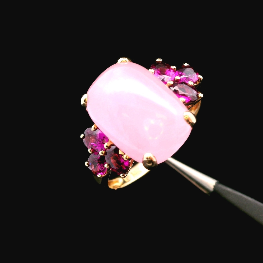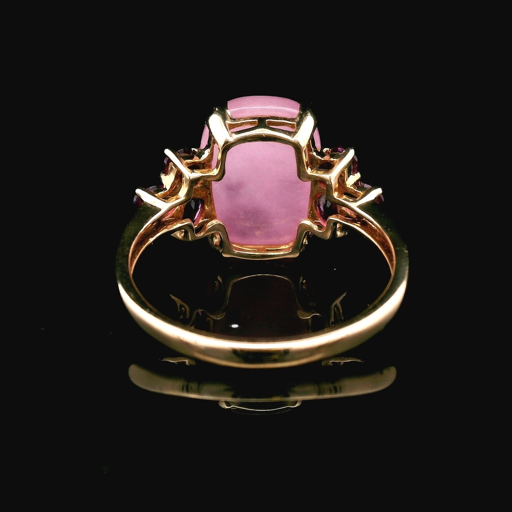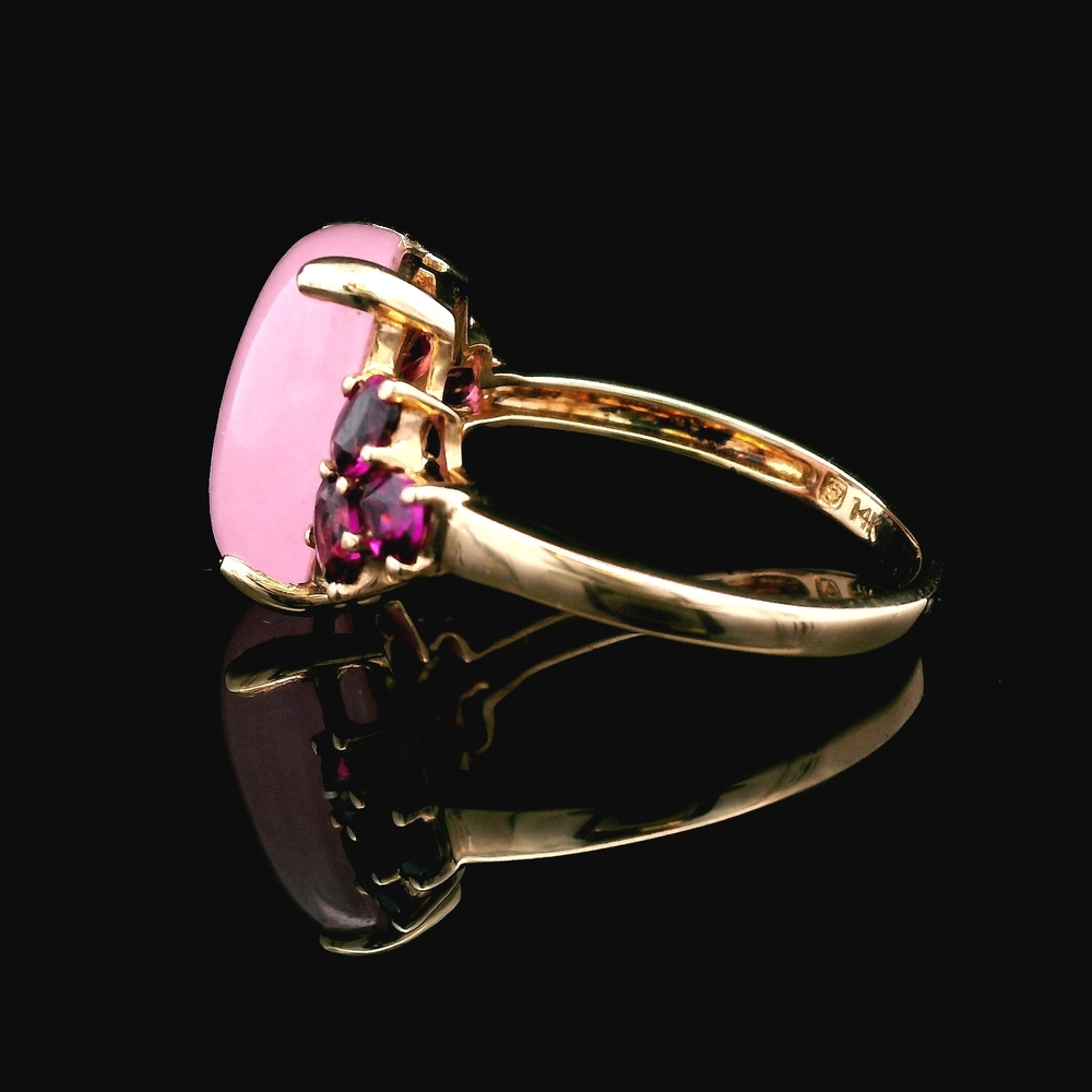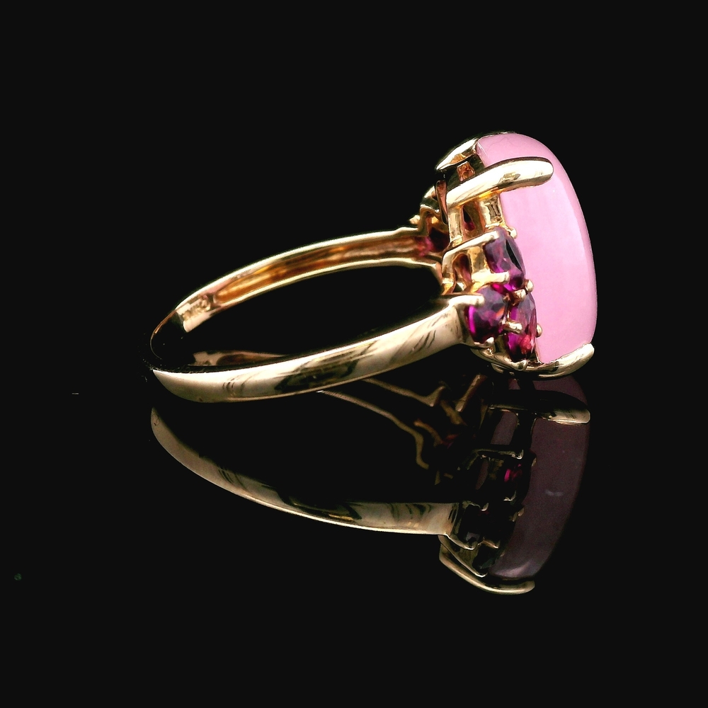 This unique ring is crafted in 14K yellow gold and features a combination of Pink Jadeite and a synthetic pink stone. The soft pink hues create a lovely, feminine look. It is a size 9.25 and has a total weight of 4.60 grams (approximately 2.96 dwt). The item is in good condition. Please review all photos closely to assess cosmetic condition and stone characteristics as the item shown is the exact one you will receive. Please note: Price may vary depending on the price of gold and silver.