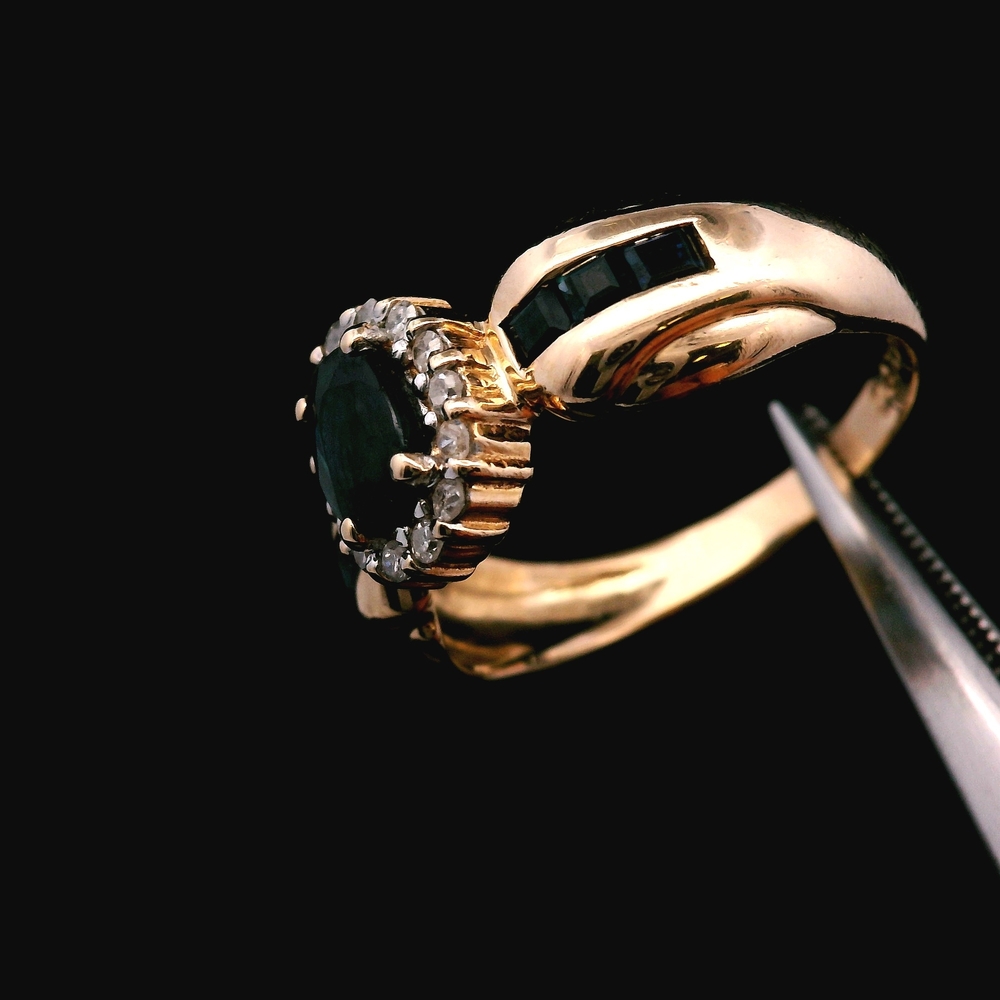 Este elegante anillo está elaborado en oro amarillo de 14K y presenta una combinación clásica de zafiros y acentos de diamantes con un total aproximado de 0.07 quilates (7 puntos). Es talla 6.25 y tiene un peso total de 2.6 dwt (aproximadamente 4.0 gramos). El artículo está en buenas condiciones. Por favor revise todas las fotos detenidamente para evaluar la condición cosmética, ya que el artículo que se muestra es exactamente el que recibirá. Tenga en cuenta: El precio puede variar dependiendo del precio del oro y la plata.