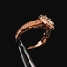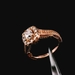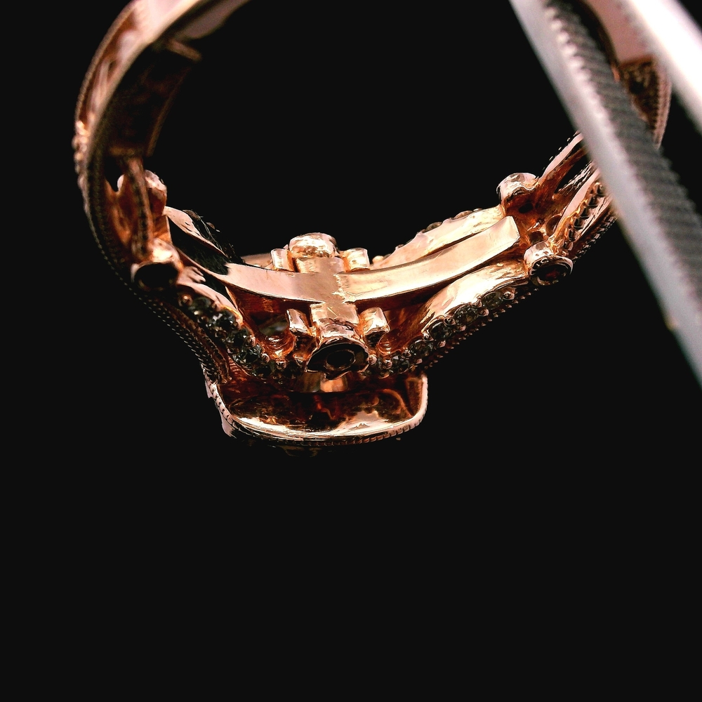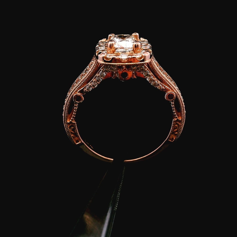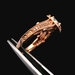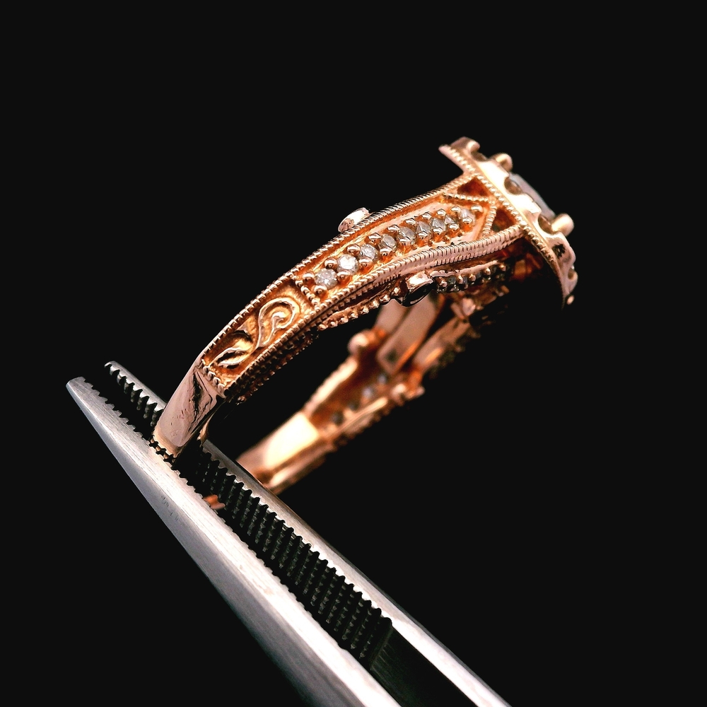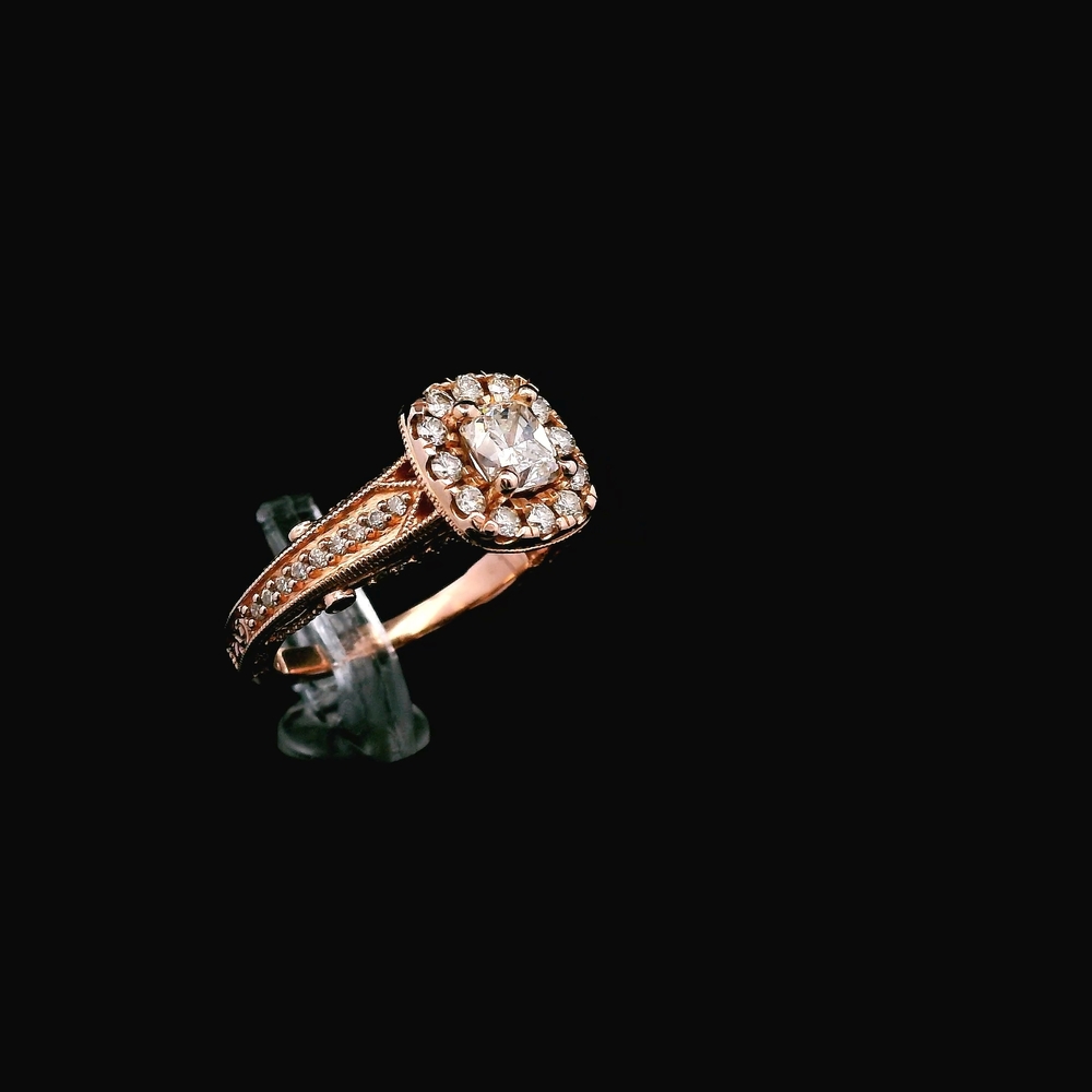 Este anillo de oro rosado de 14KT presenta un diamante certificado por IGI de .70ct, con claridad SI2 y color I, ofreciendo un brillo excelente con un tono cálido. La piedra central está acentuada por aproximadamente .50 quilate en diamantes laterales. Talla 5.75, con un peso total de 3.10 DWT (4.82 gramos).