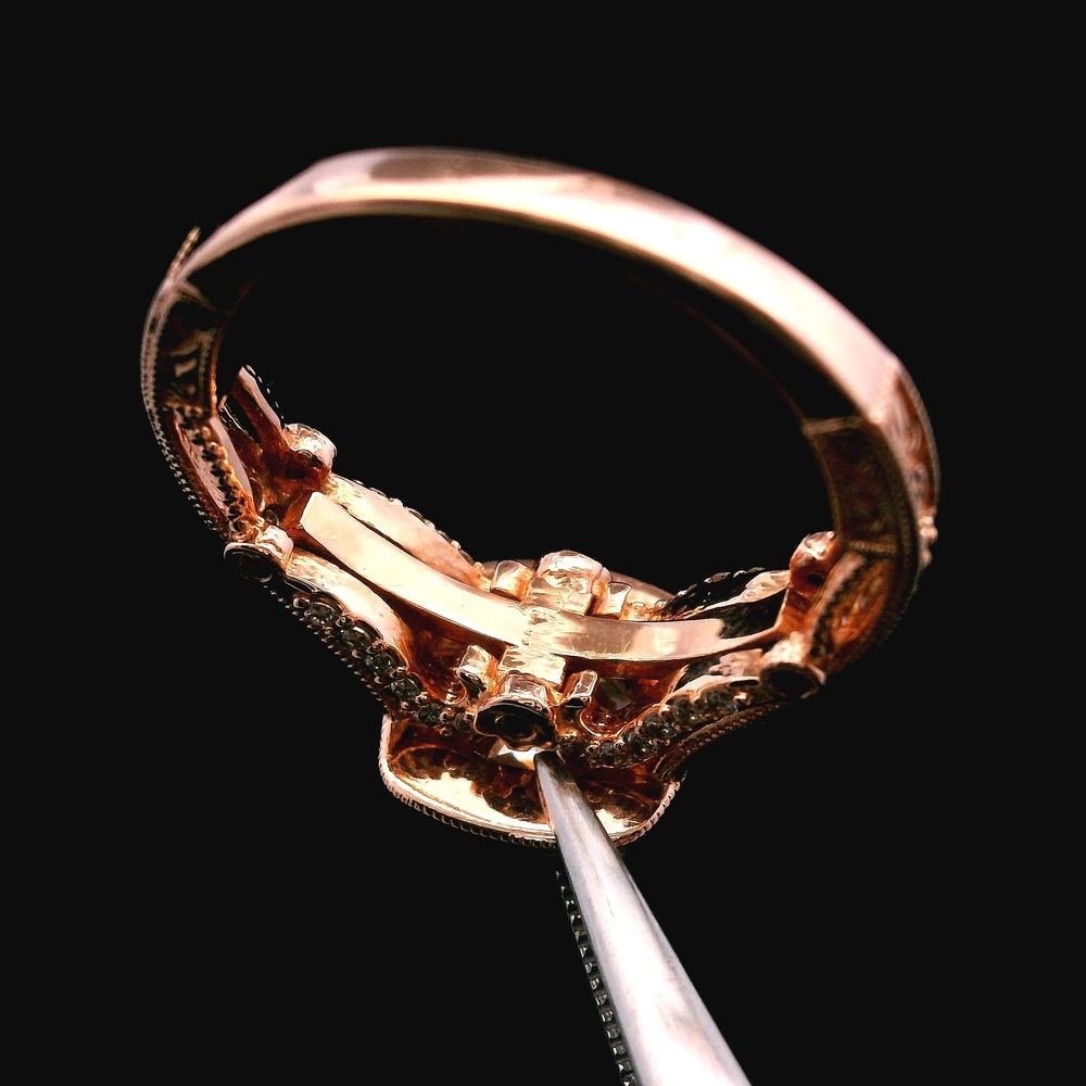 Presenta desgaste ligero normal. Los diamantes están seguros y la pieza es sólida.