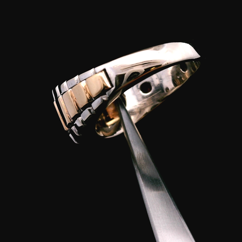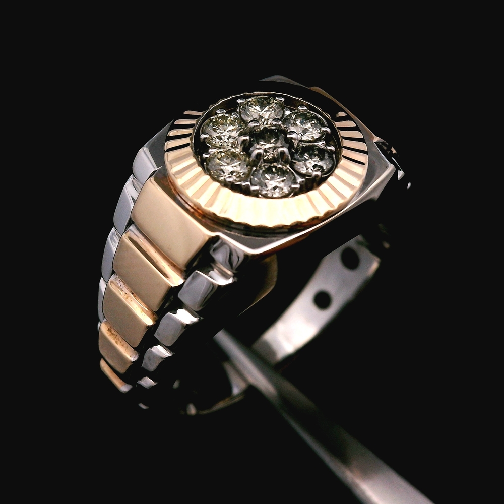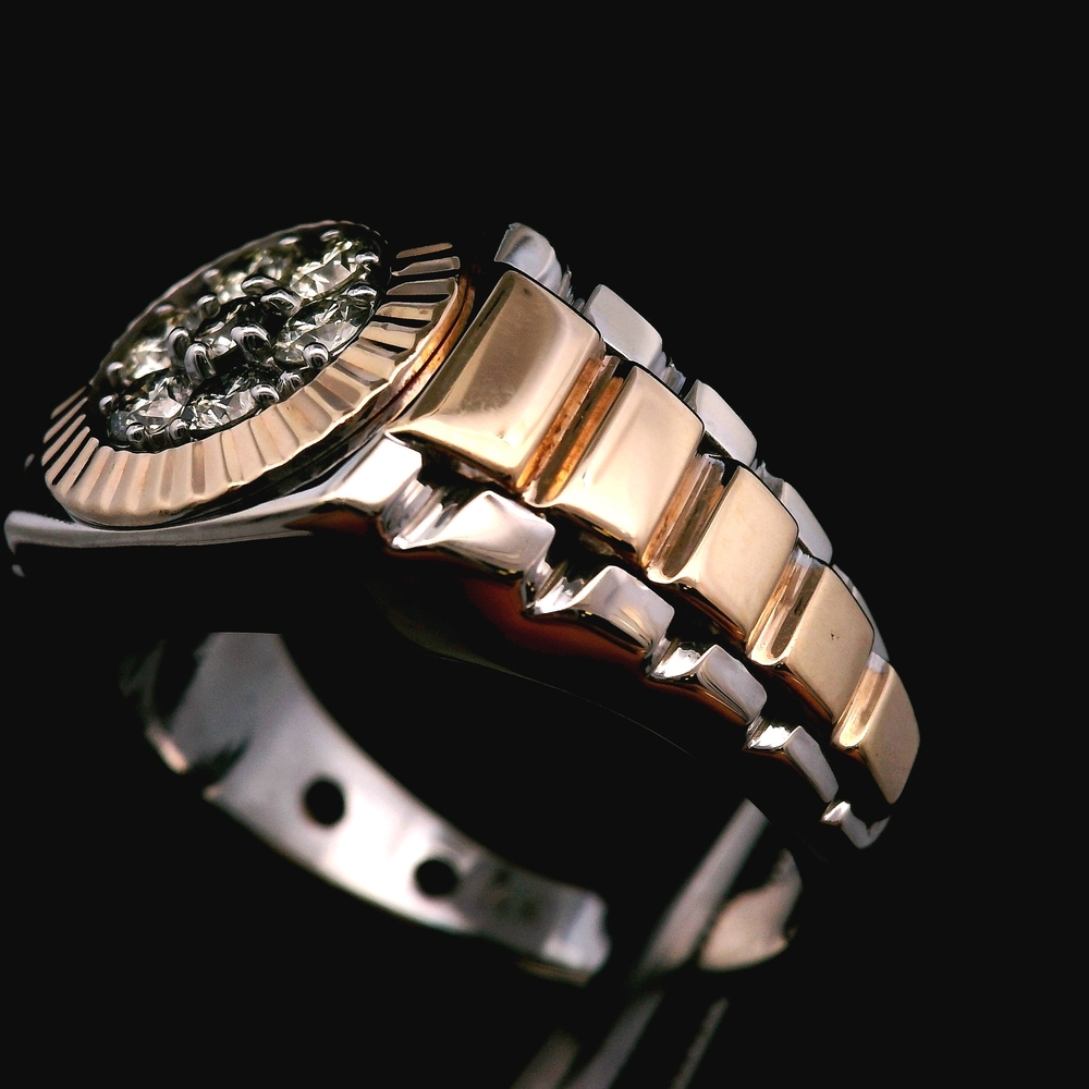 This 14KT two-tone gold Rolex-style ring features a diamond cluster of approximately 1/3cttw and is in good condition with normal light wear. The bold two-tone design paired with the cluster setting gives the piece a strong, luxurious presence. Weighing 6.30dwt, it has a solid, substantial feel without sacrificing comfort, and the size 10.25 fit makes it ideal for everyday wear or statement styling. A standout design for those who appreciate eye-catching gold jewelry.