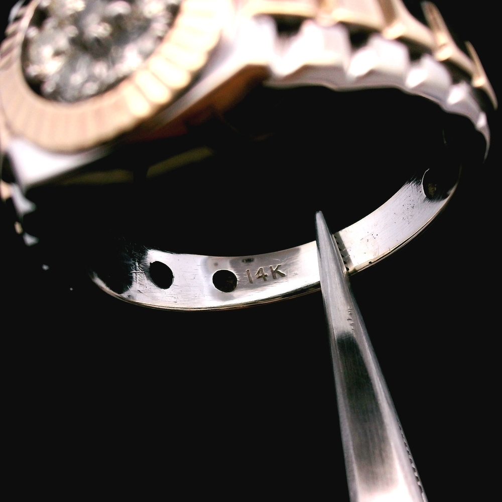 Este anillo de oro bicolor de 14KT estilo Rolex presenta un racimo de diamantes de aproximadamente 1/3cttw y está en buena condición con señales ligeras de uso normal. El diseño de dos tonos junto con el montaje tipo cluster le da una presencia fuerte y lujosa. Con un peso de 6.30dwt, ofrece una sensación sólida y cómoda, y la talla 10.25 lo hace ideal para uso diario o para un estilo llamativo. Una pieza destacada para quienes aprecian joyería de oro con presencia.