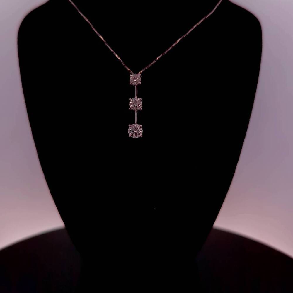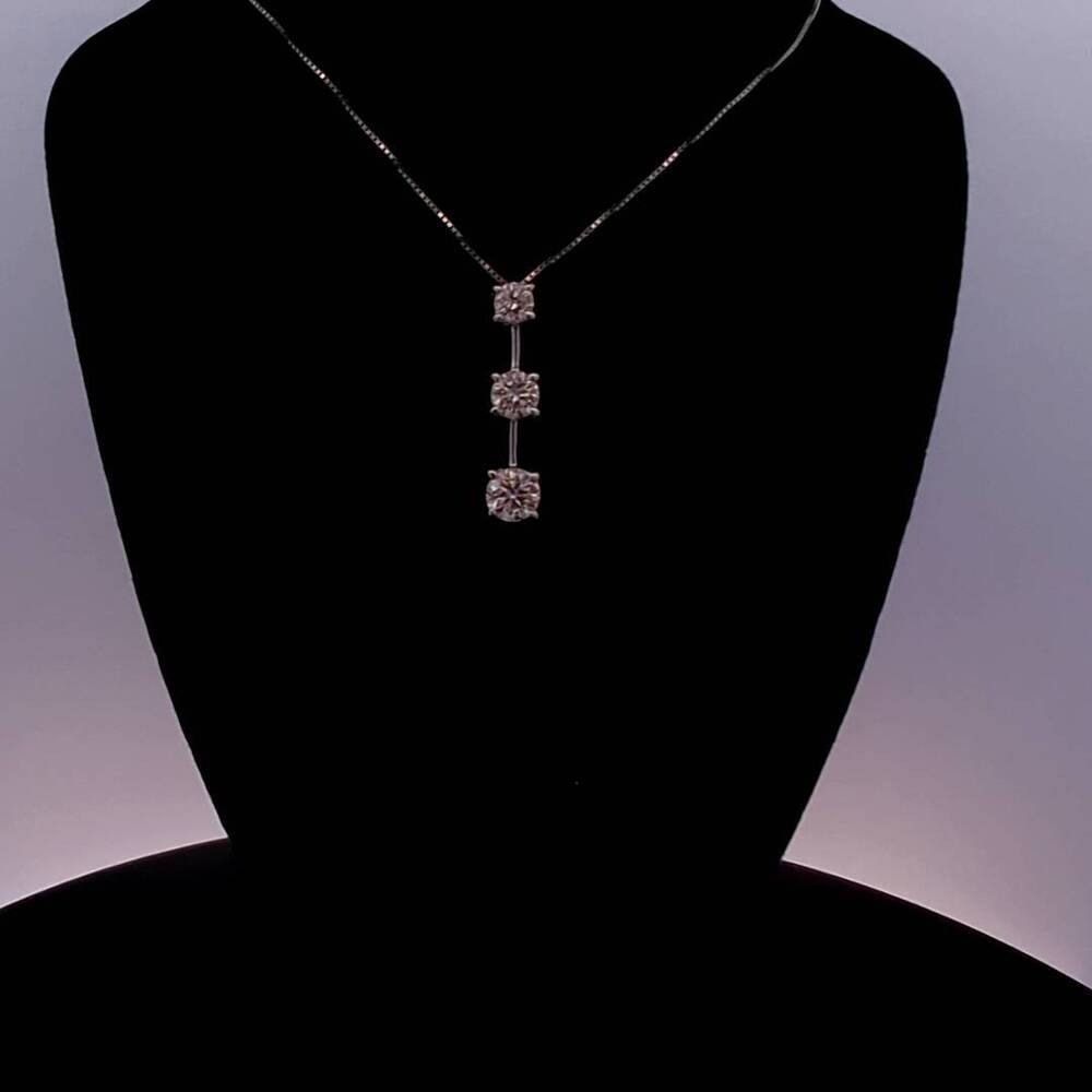 Enhance your elegance with this stunning 14KT white gold pendant necklace featuring three natural diamonds totaling 1ctw. The round-shaped diamonds are prong-set and glisten beautifully in the light. The pendant hangs from an 18-inch box chain with a spring ring closure, making it perfect for an anniversary or any special occasion. The pendant necklace is a symbol of love and is the ideal piece of fine jewelry to elevate your style.