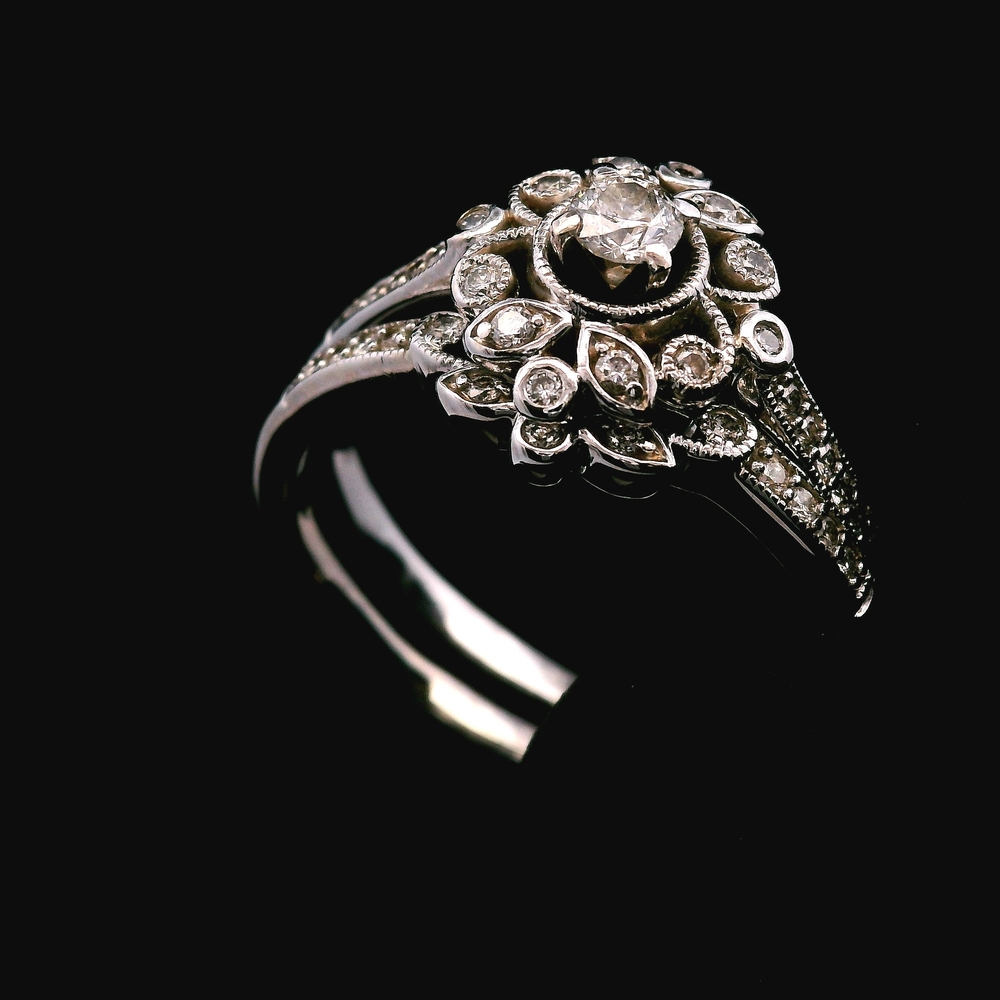 This 14KT white gold antique-style ring features approximately ? carat total weight in diamonds, arranged in a classic and detailed setting that reflects vintage charm and character. The design offers presence without being too flashy, making it a strong everyday or special-occasion piece.