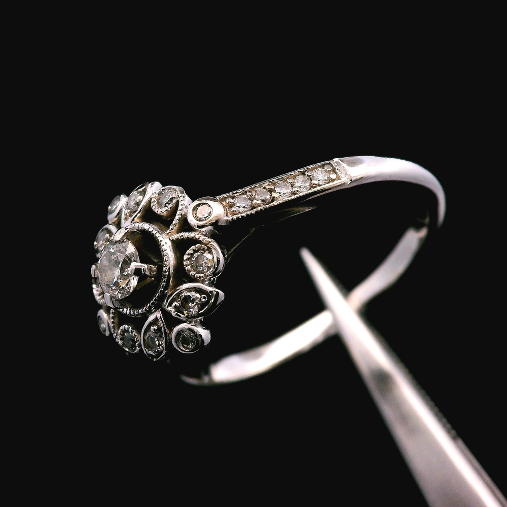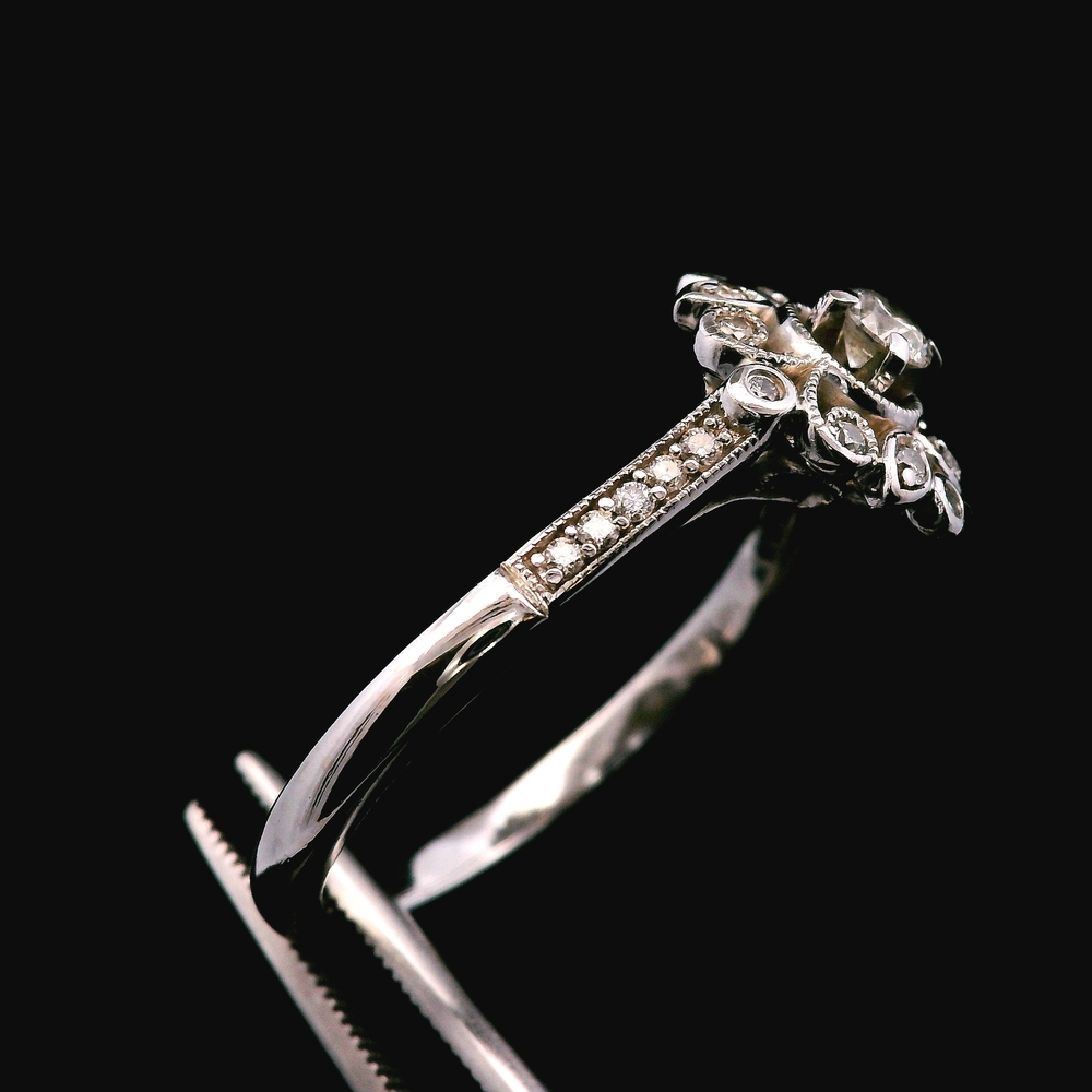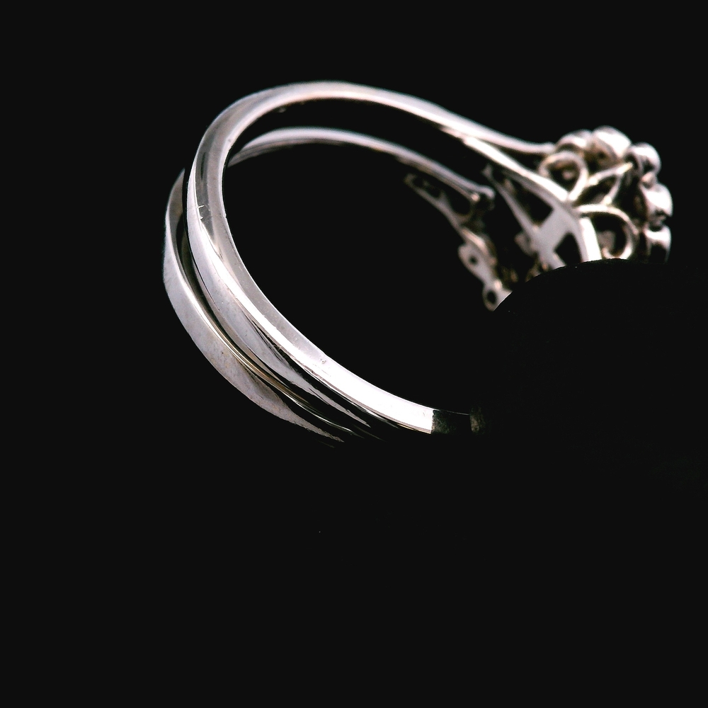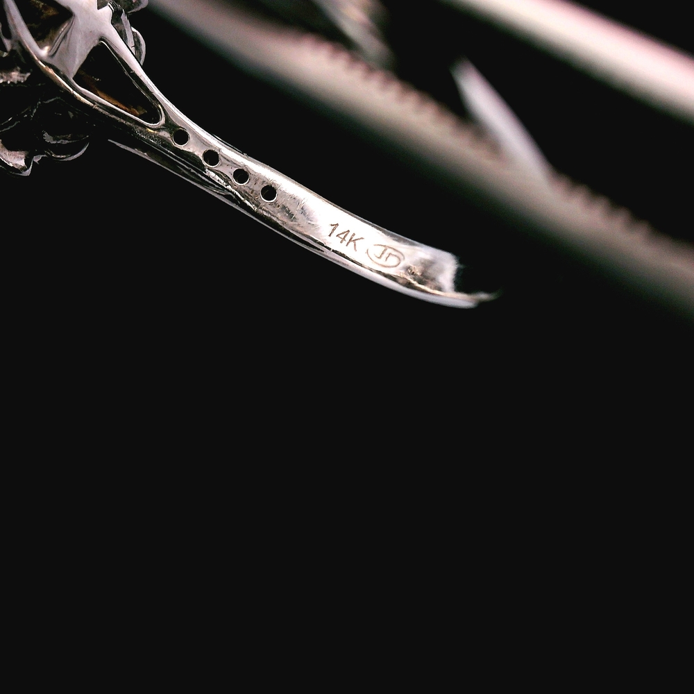 Este anillo estilo antiguo en oro blanco de 14KT presenta aproximadamente ? quilate en diamantes, con un diseño detallado y clásico que refleja encanto y carácter vintage. La pieza tiene presencia sin ser demasiado llamativa, ideal para uso diario o ocasiones especiales.