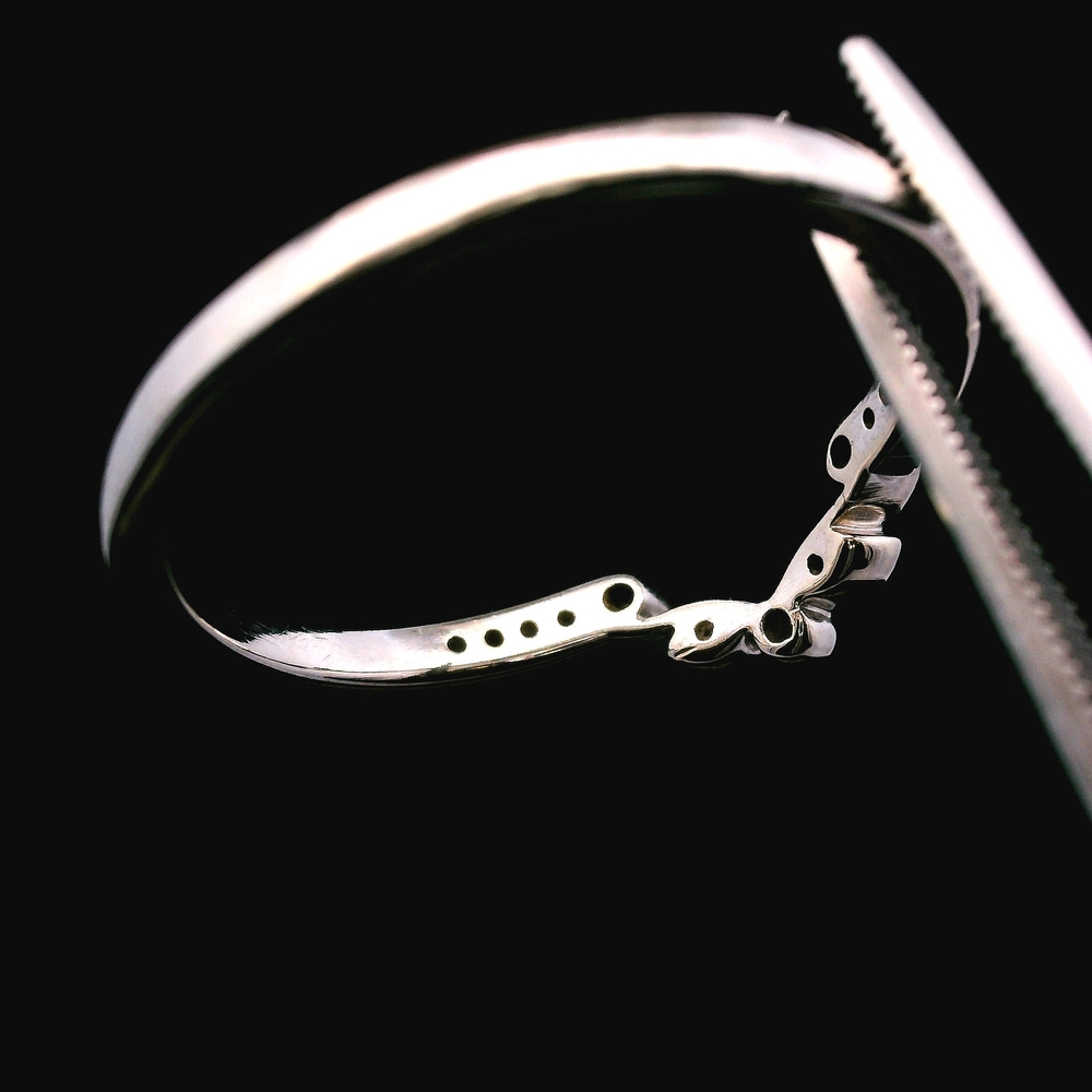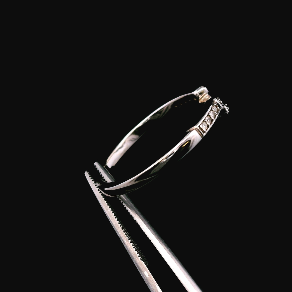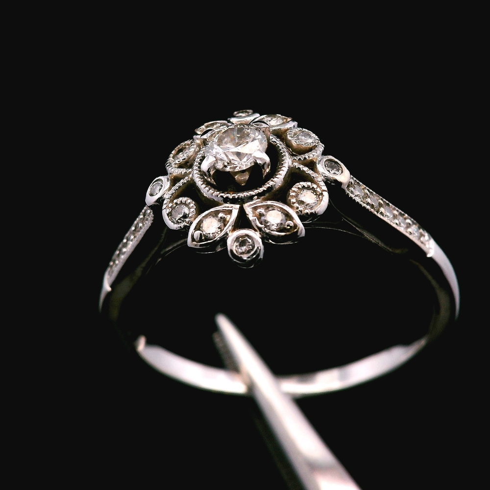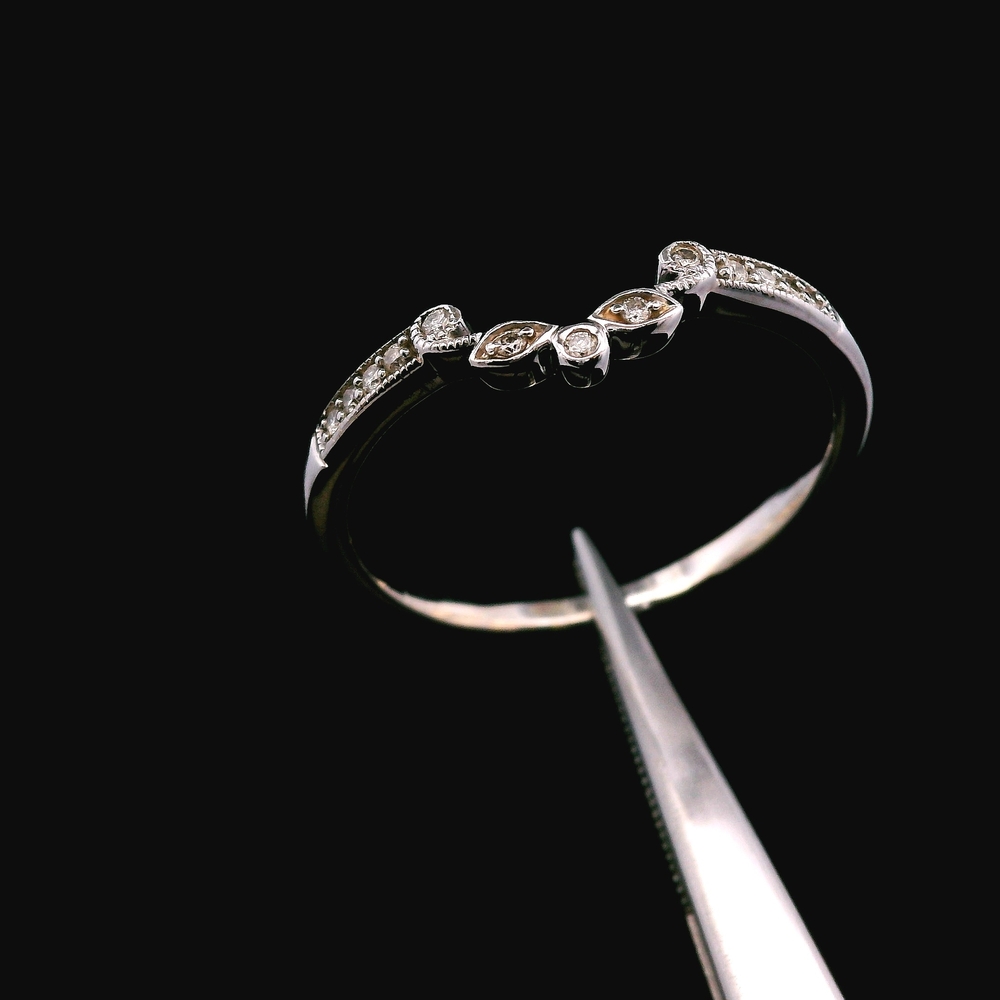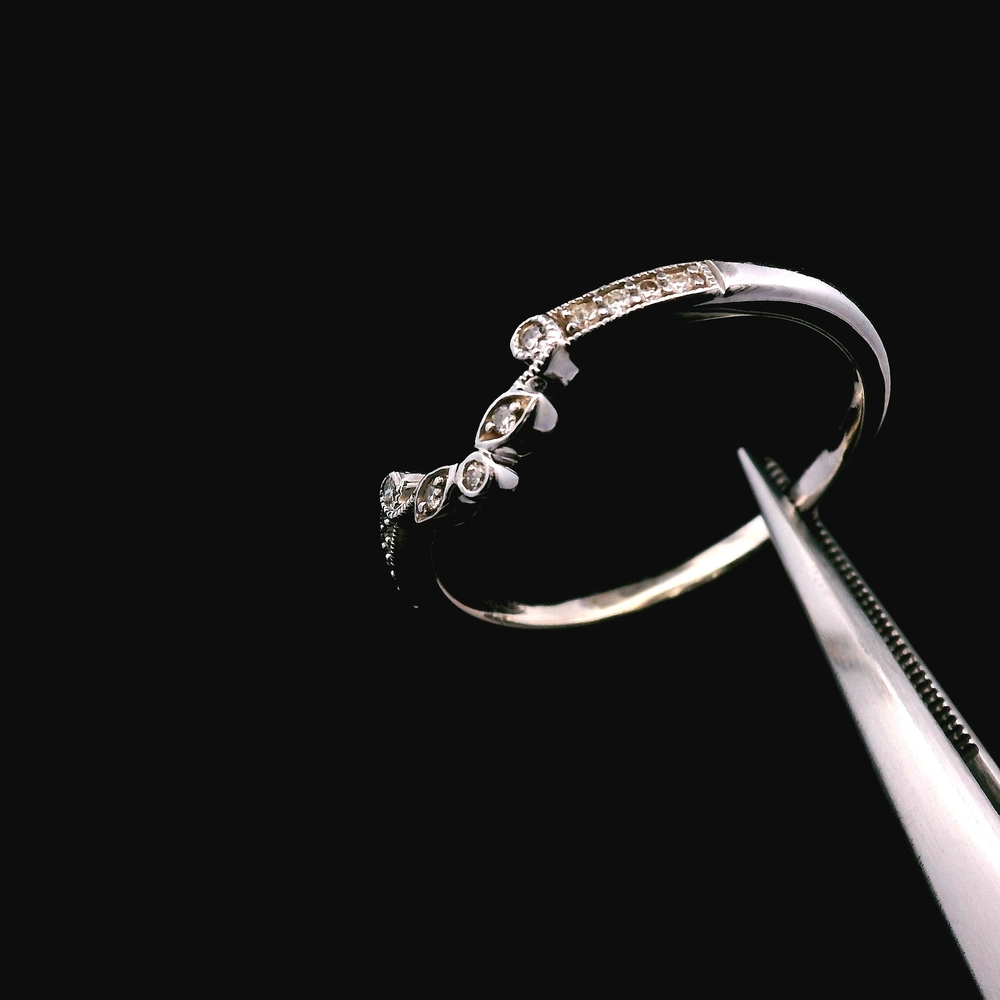 Este anillo estilo antiguo en oro blanco de 14KT presenta aproximadamente ? quilate en diamantes, con un diseño detallado y clásico que refleja encanto y carácter vintage. La pieza tiene presencia sin ser demasiado llamativa, ideal para uso diario o ocasiones especiales.