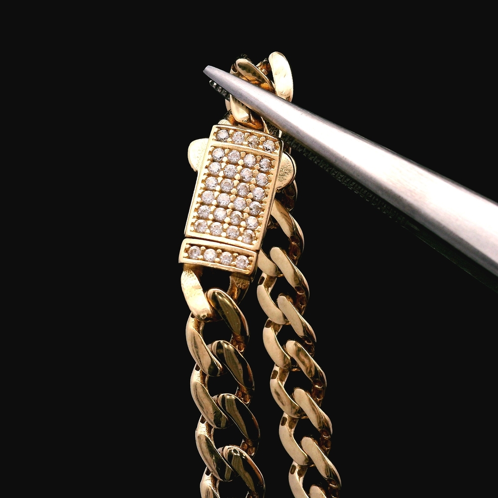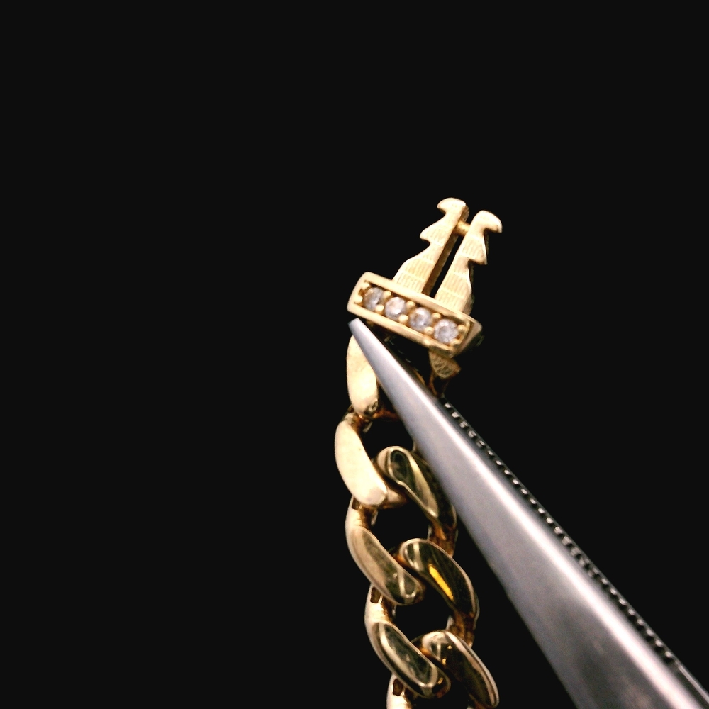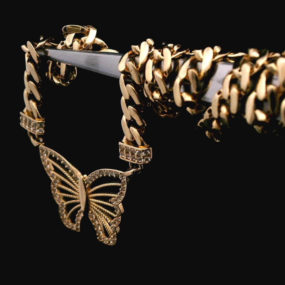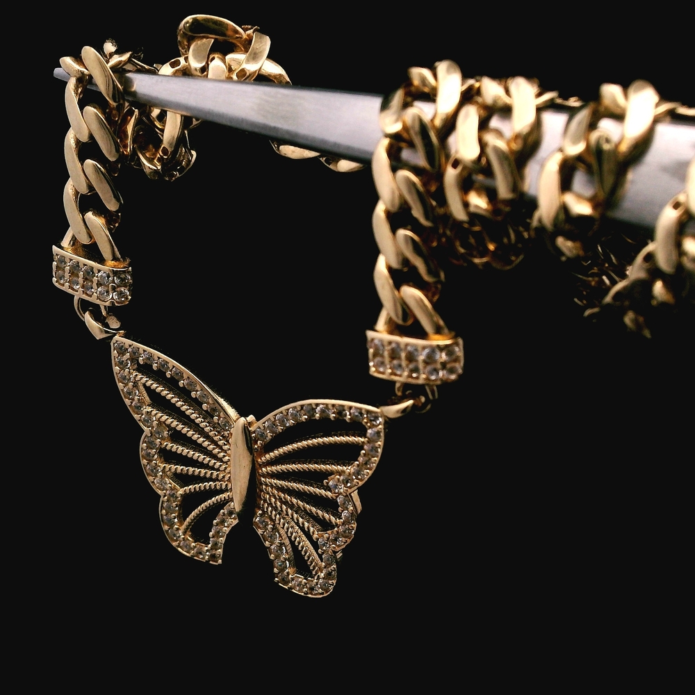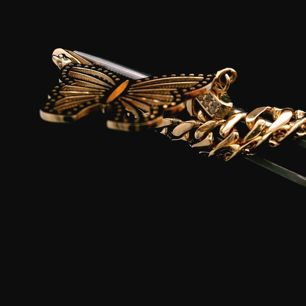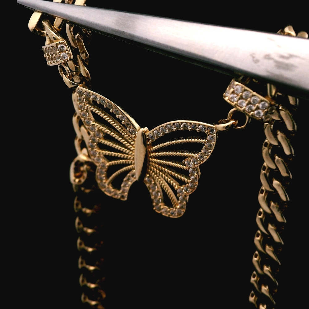 Esta cadena con dije de mariposa en oro amarillo de 14KT pesa 7.2dwt y mide 16 pulgadas de largo. La mariposa incluye circonias cúbicas que añaden brillo y encanto, complementando el cálido resplandor del oro. El colgante está unido permanentemente a la cadena y no puede retirarse, ofreciendo un diseño uniforme y elegante. Está en buena condición con desgaste ligero normal, siendo una pieza versátil y atractiva para cualquier colección.