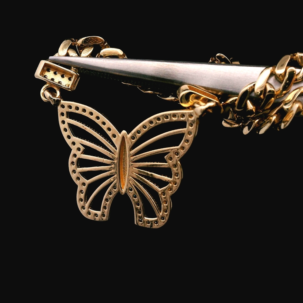 This 14KT yellow gold chain and butterfly pendant weighs 7.2dwt and measures 16 inches in length. The butterfly features bright CZ stones that add sparkle and charm, complementing the warm shine of the gold. The pendant is permanently attached to the chain and cannot be removed, giving the piece a seamless, unified look. It is in good condition with light, normal wear, making it a stylish and versatile accessory for any collection.