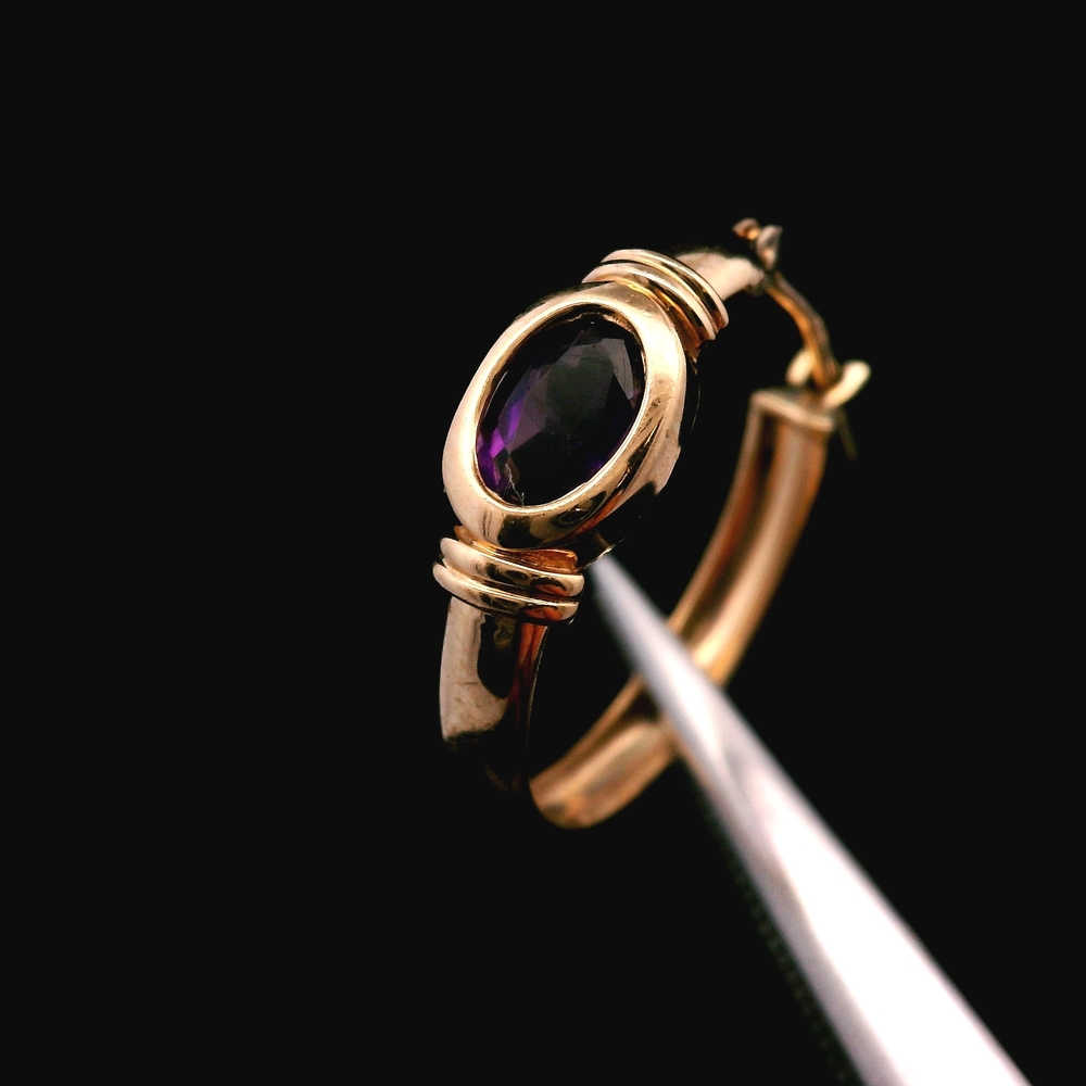 These 14KT yellow gold hoop earrings feature vibrant amethyst stones, adding a rich pop of purple color to the classic hoop design. The warm gold tones complement the gemstones beautifully, creating a stylish and versatile pair suitable for daily wear or special occasions.