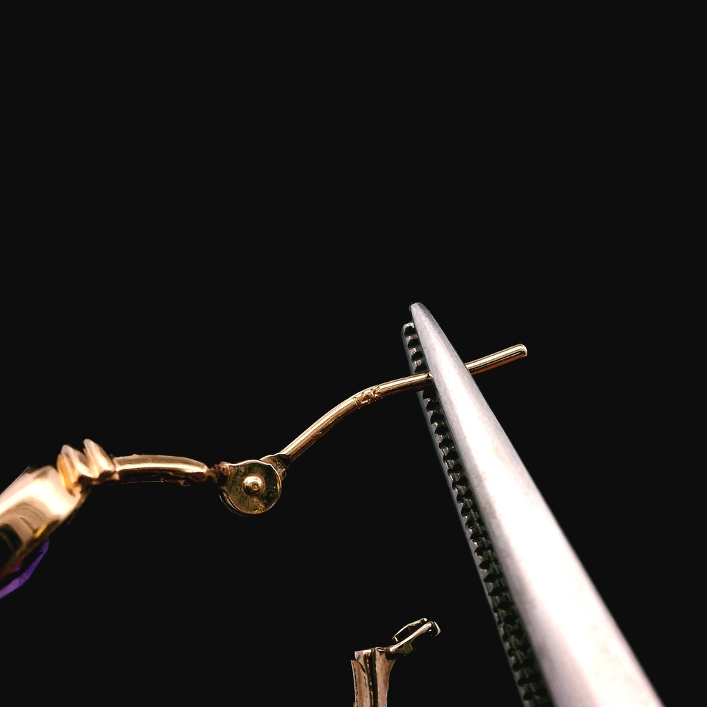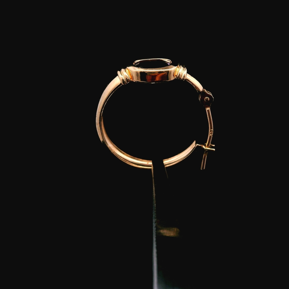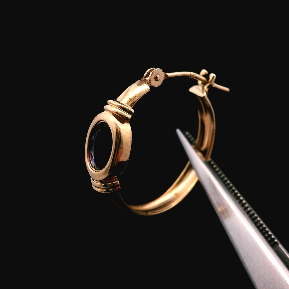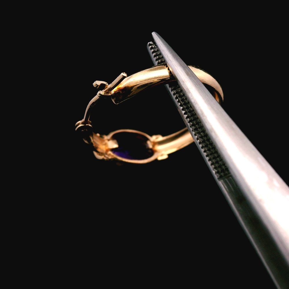 Estos aretes tipo argolla de oro amarillo de 14KT incluyen amatistas vibrantes, que aportan un llamativo toque de color púrpura al diseño clásico. El tono cálido del oro complementa perfectamente las piedras, creando un par elegante y versátil ideal para uso diario o para ocasiones especiales.