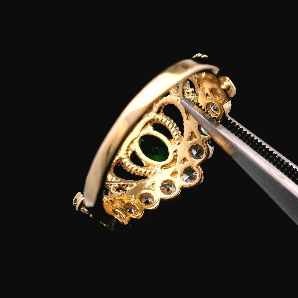 Este anillo de corona en oro amarillo de 14KT presenta piedras CZ verdes en un diseño llamativo y elegante. La forma distintiva lo hace resaltar, ya sea usado solo o combinado. Talla 7, con un peso total de 2.30 DWT (3.58 gramos). Incluye caja genérica para anillo.