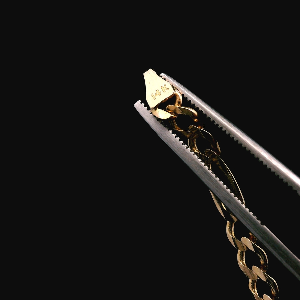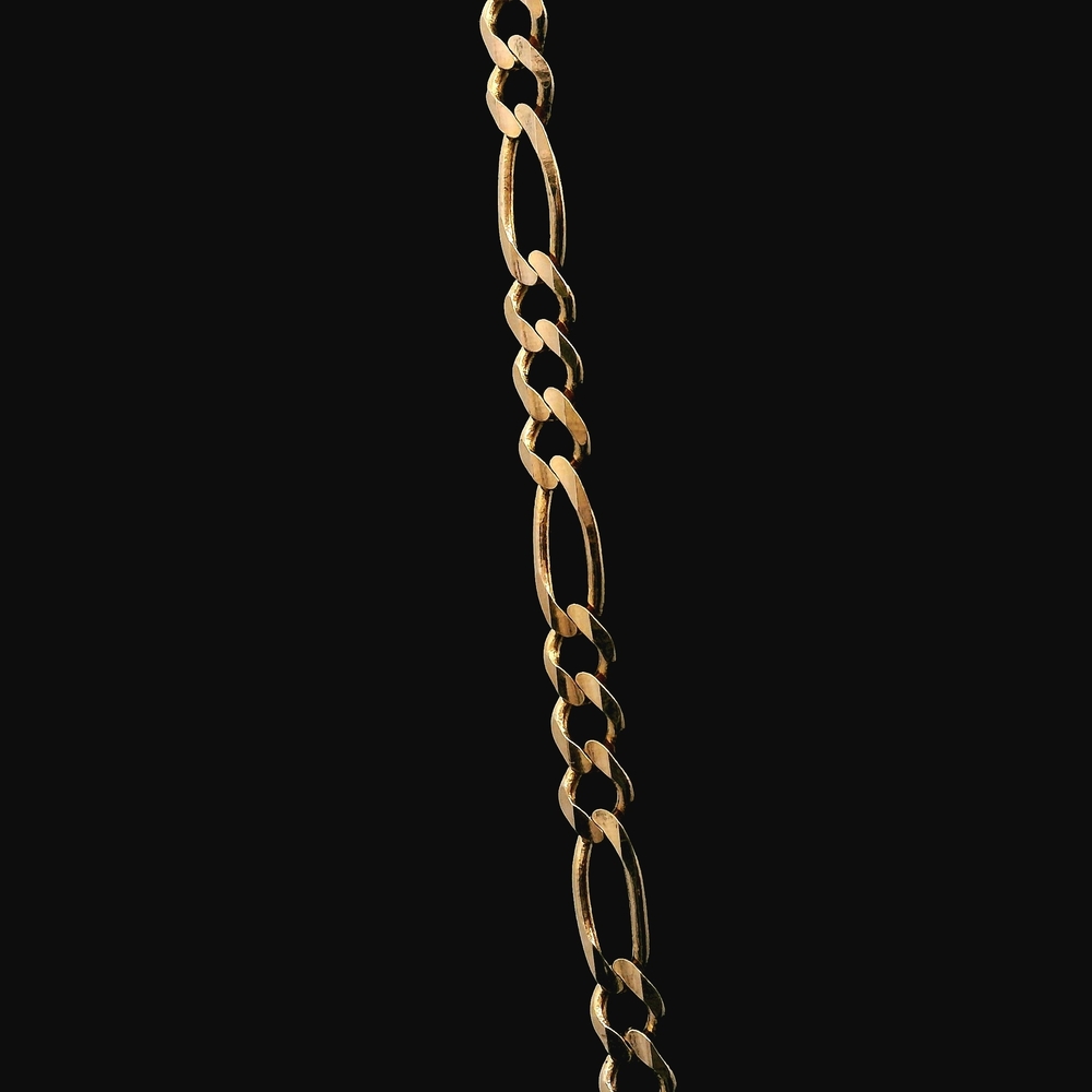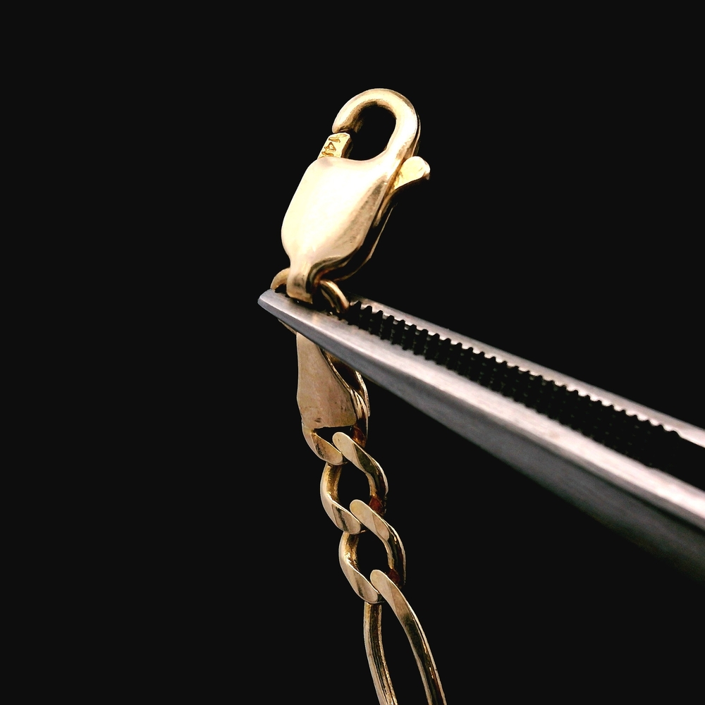 This 14KT yellow gold Figaro chain features the classic alternating pattern of short and long links, giving it a sleek and timeless look. Its polished finish and medium weight make it suitable for both daily wear and layering with pendants.