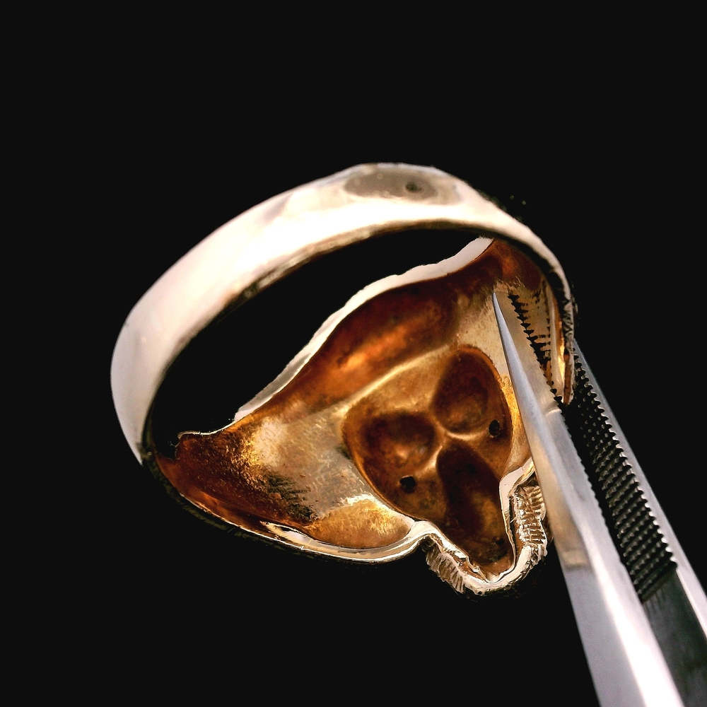 Este anillo de león en oro amarillo de 14KT presenta un diseño detallado y llamativo, acentuado con aproximadamente 5 puntos de diamantes, agregando brillo al estilo robusto de la pieza.
