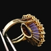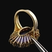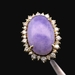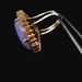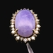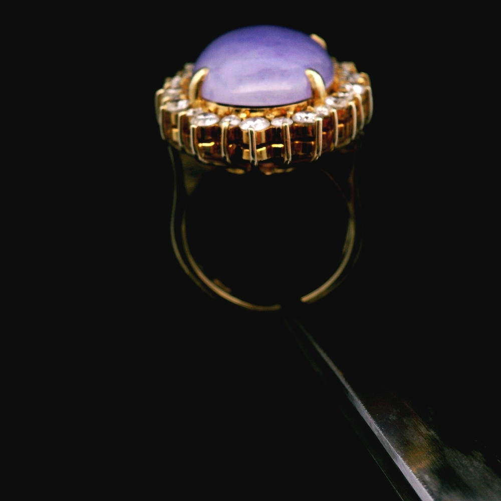 Este anillo de oro amarillo de 14KT presenta una piedra central de jade púrpura rodeada por un halo de diamantes con un peso total aproximado de 1.5 quilates, creando una apariencia elegante y llamativa. El tono cálido del oro complementa perfectamente el color profundo del jade. Talla 6.5, con un peso total de 8.40 DWT (13.06 gramos). Incluye caja genérica para anillo.