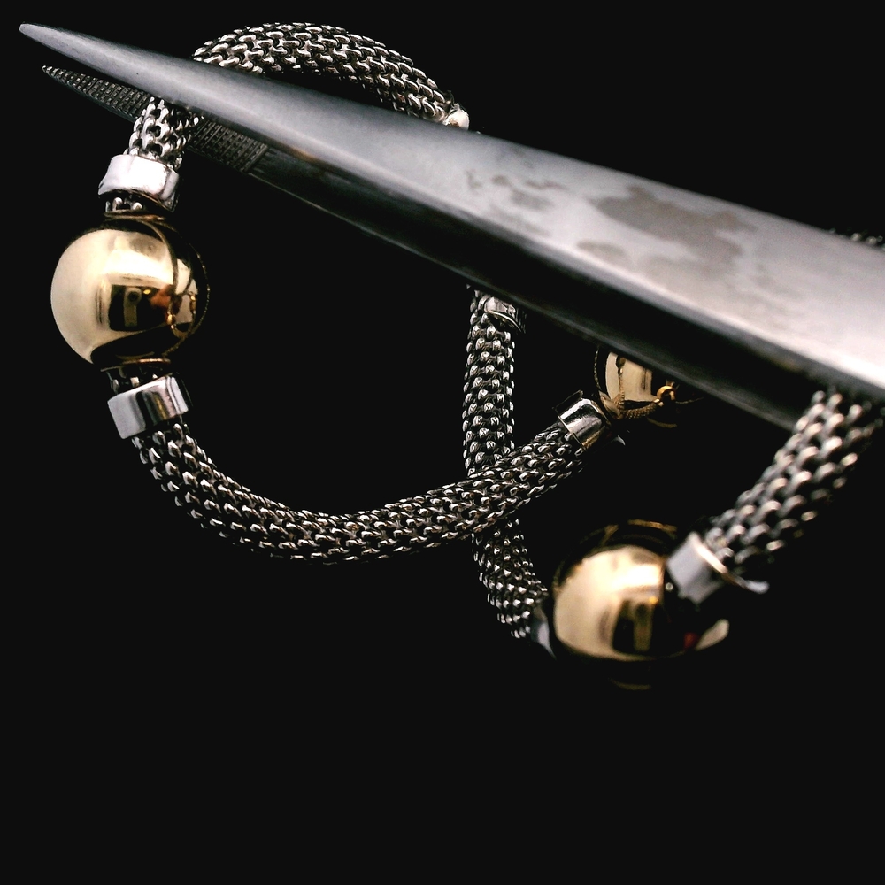 Esta pulsera de oro amarillo de 14KT en dos tonos presenta un contraste elegante entre los colores del oro, ofreciendo un estilo moderno y versátil. Su acabado pulido añade un toque de elegancia y su construcción sólida la hace ideal para uso diario.