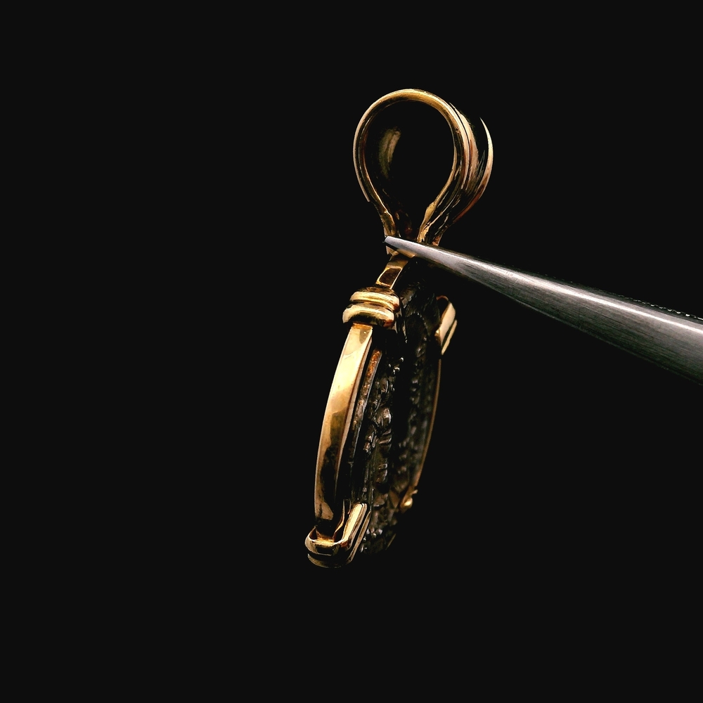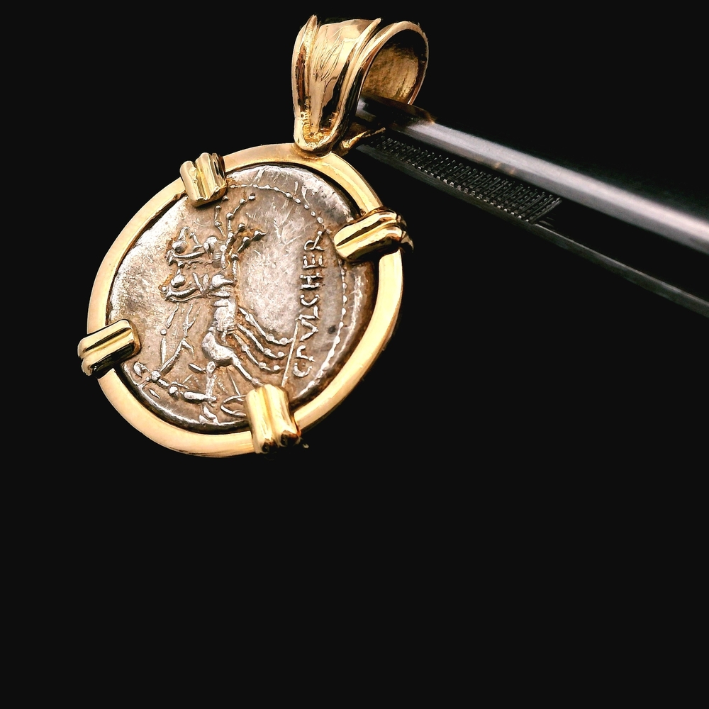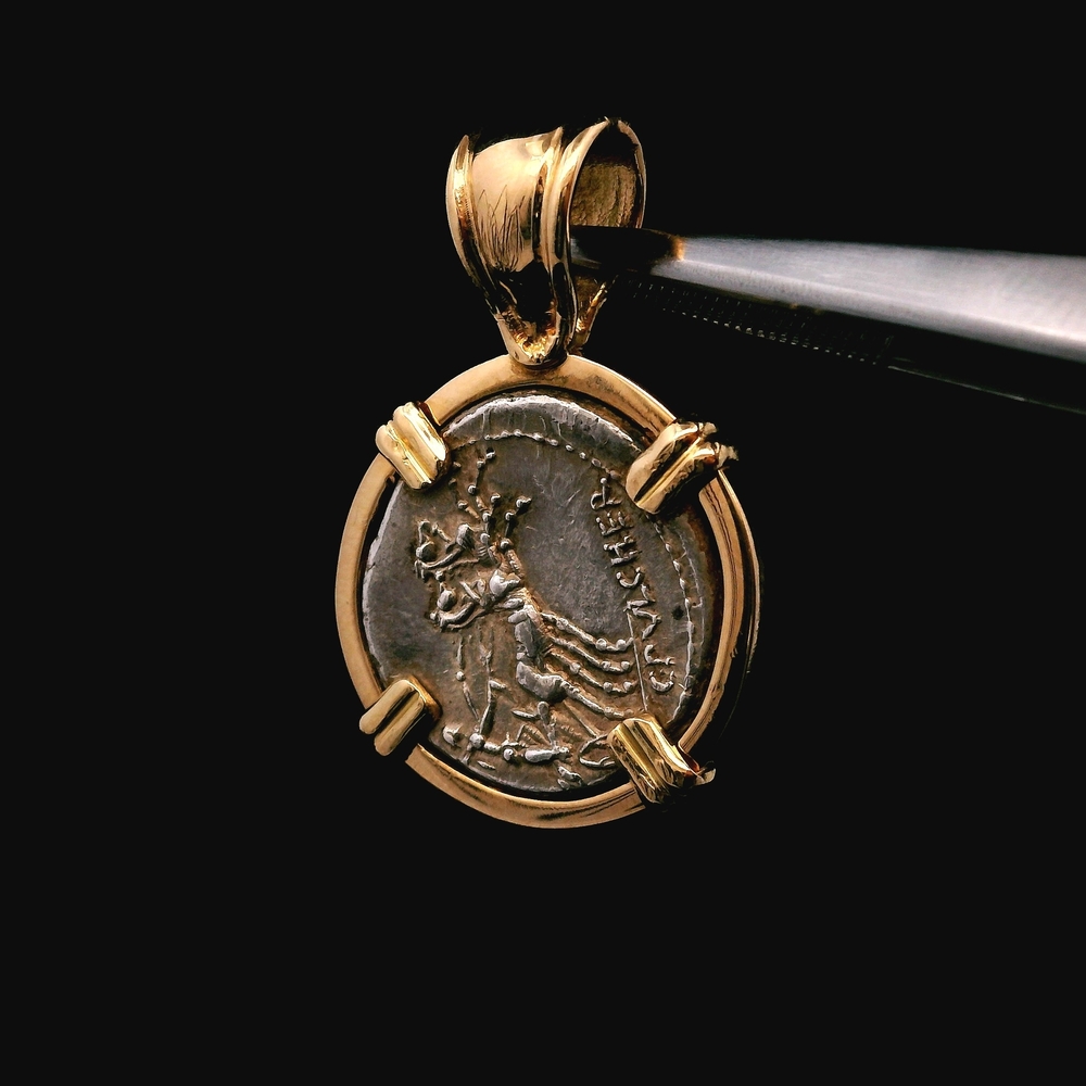 This exceptional piece of history is a pendant featuring an authentic Roman Republic Denarius coin, dating back to approximately 100 BC. The ancient silver coin is securely bezel-set in rich 18KT Yellow Gold, creating a stunning contrast between antiquity and luxury. Coin: Roman Republic Denarius (approx. 100 BC) Setting Material: 18KT Yellow Gold Weight: 2.80 dwt (approx. 4.35 grams) The item is in good condition. Please review all photos closely to assess the coin's detail/patina and the gold setting, as the item shown is the exact one you will receive.