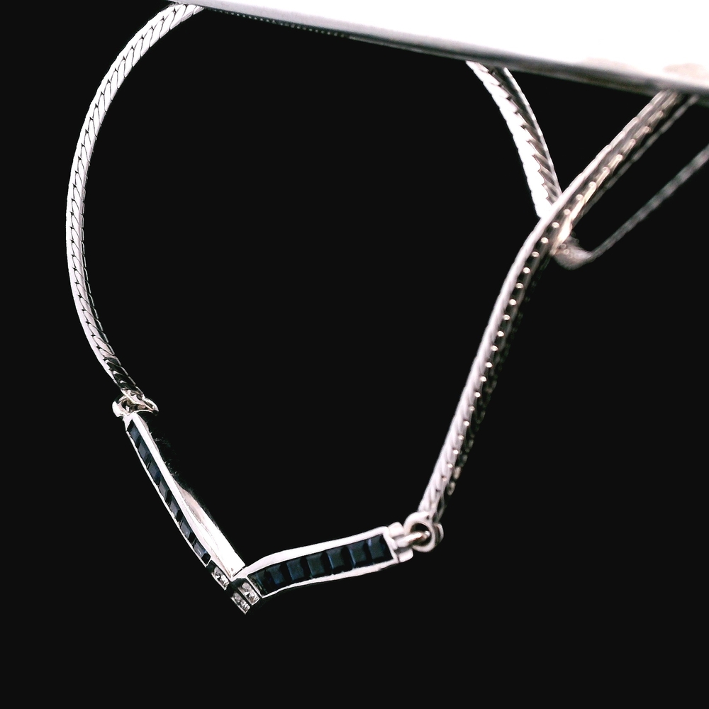 This 18KT white gold necklace features natural sapphires accented by approximately 7.5 points total weight in diamonds, offering a refined sparkle and a classic elegant look. The necklace measures 16 inches, making it perfect for everyday wear or layering. Total weight is 4.7 DWT (7.32 grams). Includes a generic jewelry box.
