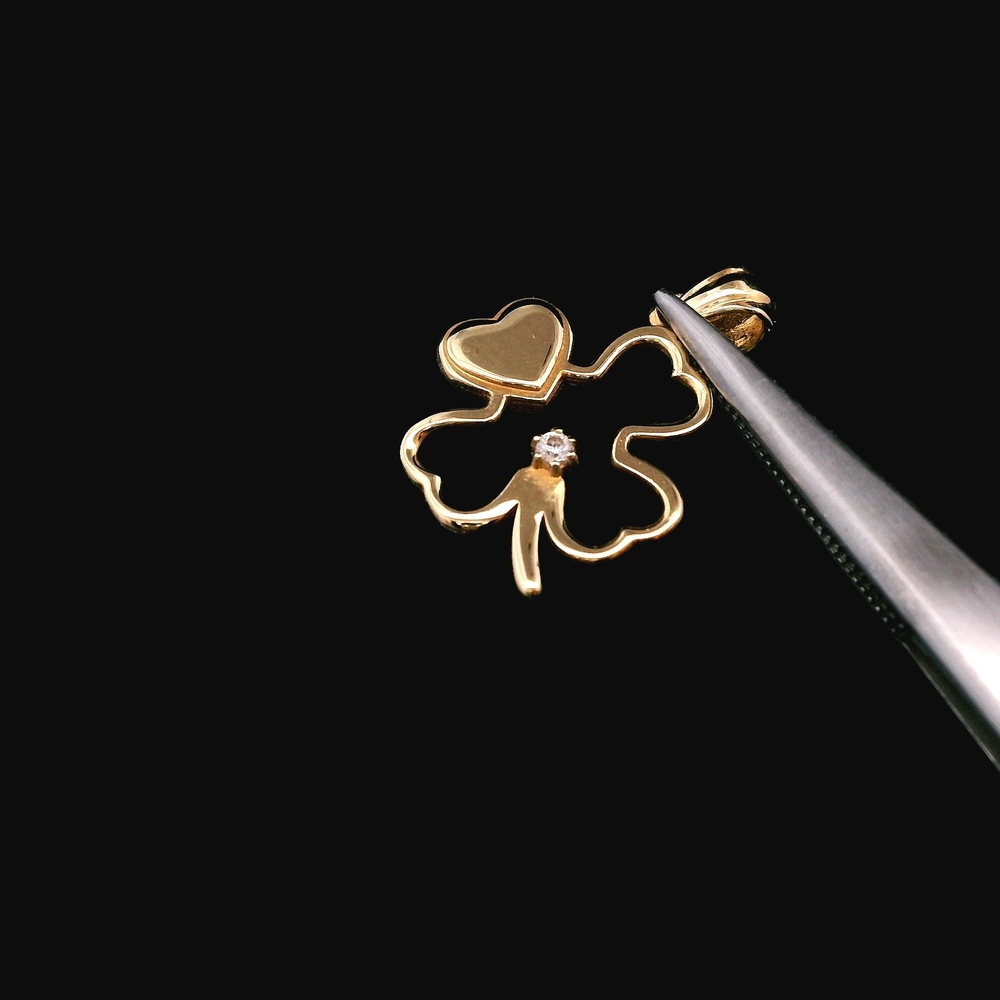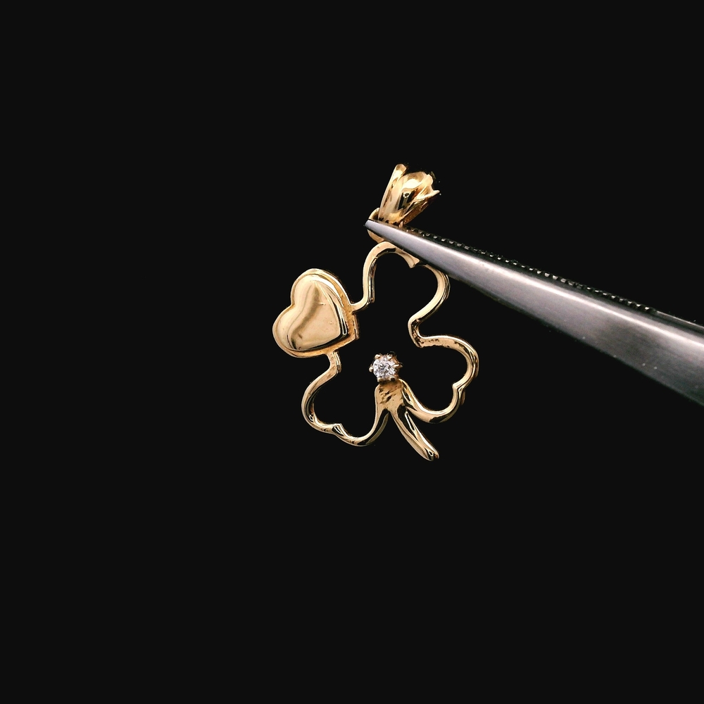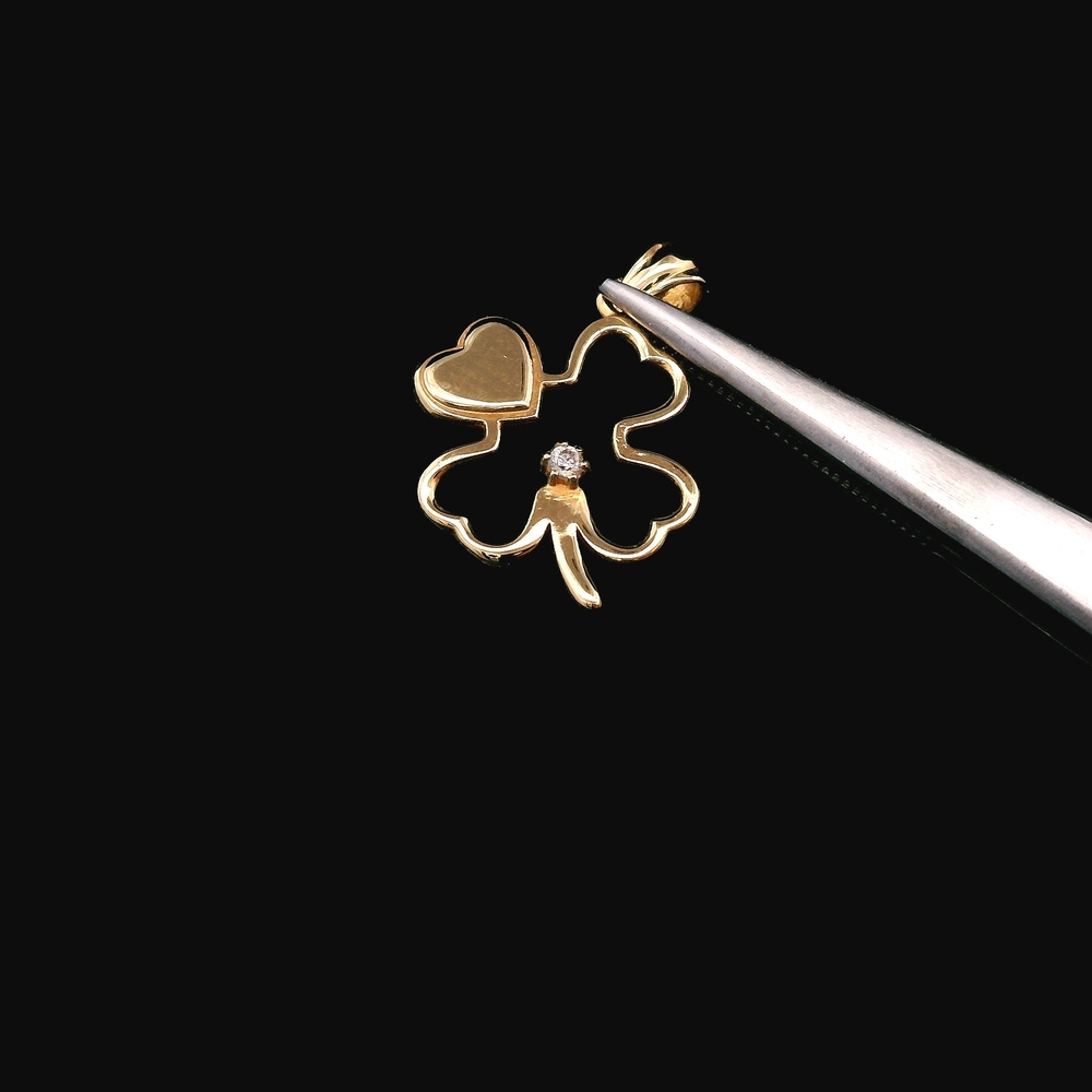 Este dije/colgante de trébol en oro amarillo de 18KT incluye acentos de circonia cúbica y está en buena condición con uso ligero y normal. El diseño de trébol ofrece un estilo encantador y simbólico, mientras que el oro de 18KT aporta un brillo cálido y elegante. Con un peso de 0.60dwt, es liviano y fácil de combinar con diferentes cadenas, convirtiéndolo en una pieza versátil para cualquier colección.