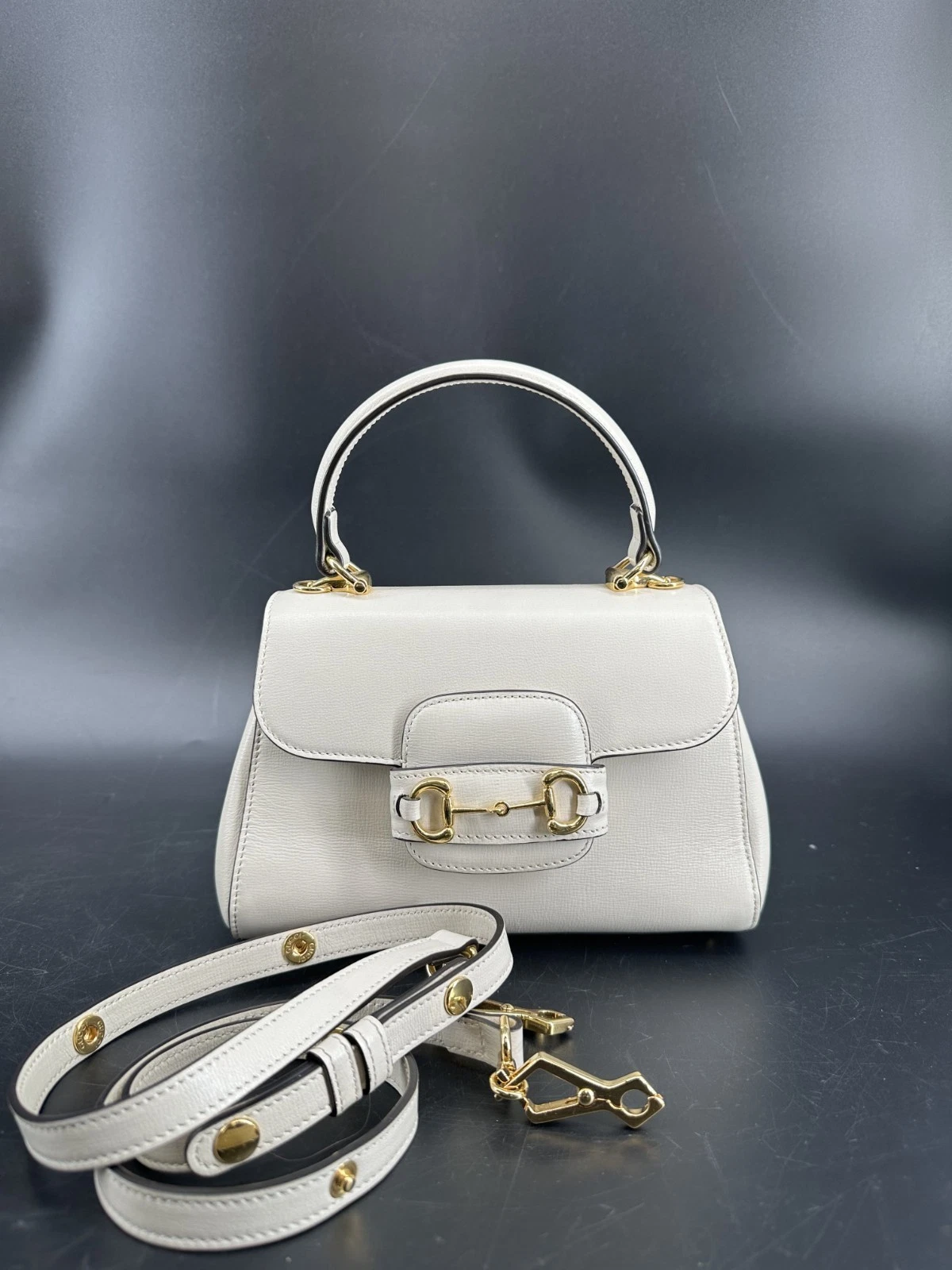 El bolso Authentic Gucci Horsebit 1955 Mini es un accesorio de lujo atemporal que presenta el icónico detalle Horsebit de Gucci y una construcción en cuero de primera calidad. Con un diseño compacto, correa de hombro ajustable y herrajes característicos, este bolso es perfecto para una versatilidad de día a noche, ofreciendo una elegante combinación de herencia y estilo moderno.